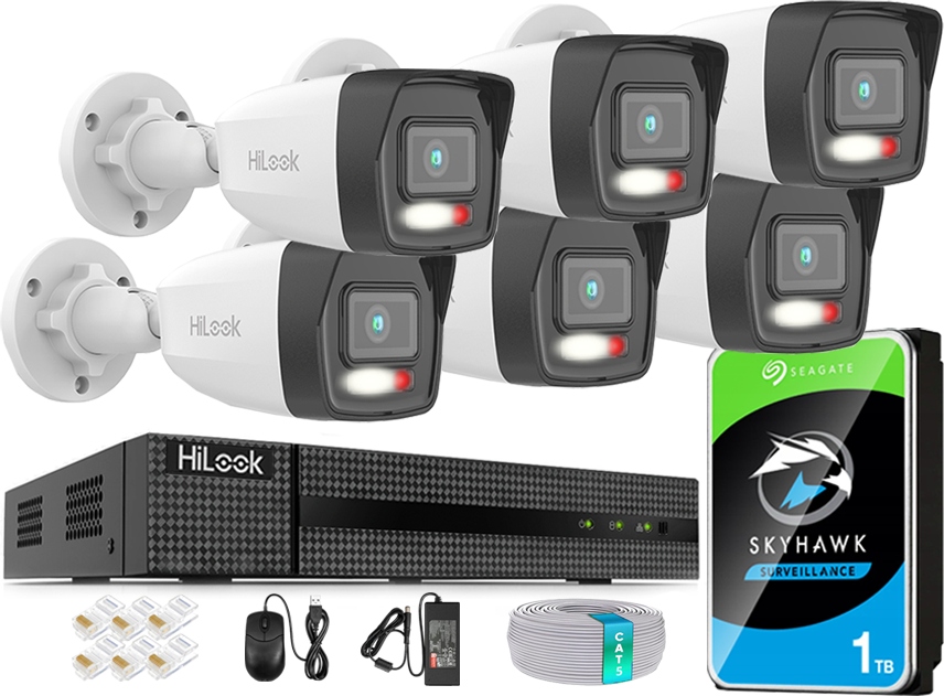 6 наружных IP-камер 6 Мп HiLook | 1x 8-канальный PoE-рекордер | 1 диск емкостью 1 ТБ | Кабели и монтажные аксессуары