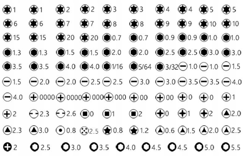 • 10 крестообразных: 2x PH0000, 2x PH000, 2x PH00, 2x PH0, 1x PH1, 1x PH2 ;