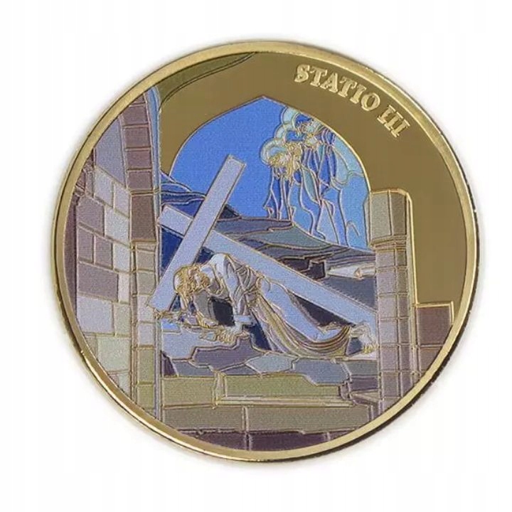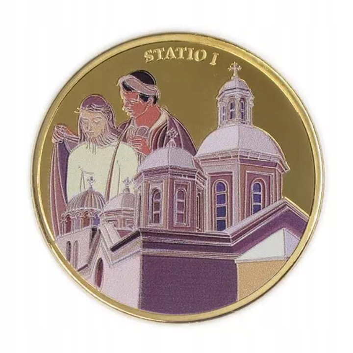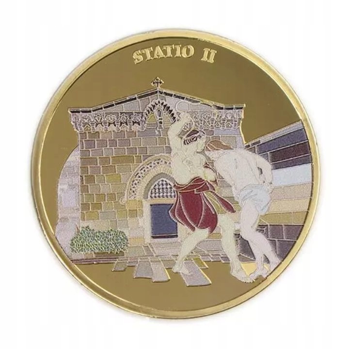 Набор из 14 монет: Виа Долороза, цветная, позолоченная бронза 2016 г. Prooflike — уникальный экземпляр, содержащий специально отобранные монеты. «Виа Долороза» (с латыни «Путь страданий») — это настоящая историческая улица в стенах Старого города Иерусалима, и широко распространено мнение, что это путь, по которому Иисус прошел от суда до распятия и погребения. В набор входят цветные монеты, содержащие 14 Крестных станций.
