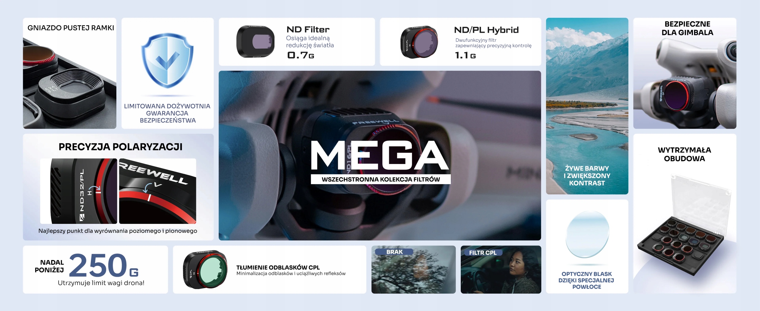 Каждая рамка фильтра проходит строгие испытания на легкость с использованием технологии GimbalSafe от Freewell, гарантирующей отсутствие вредного воздействия на подвес дрона.