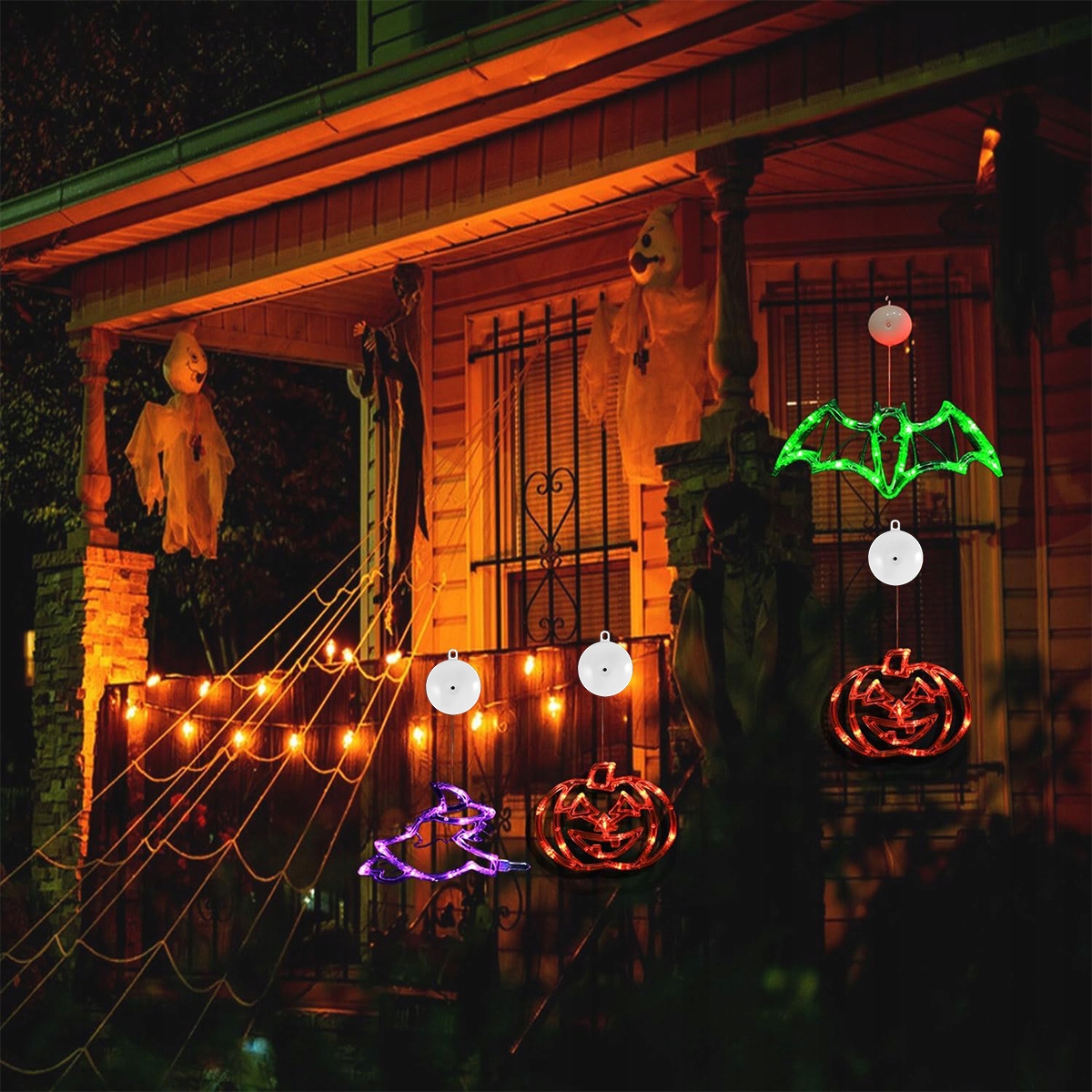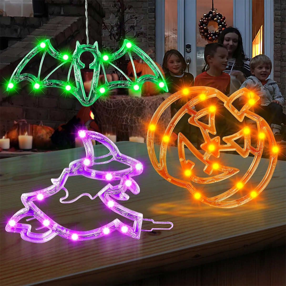 ⭐ Светодиодное украшение для окна на Хэллоуин — включает в себя 3 оконных фонаря для Хэллоуина (оранжевый свет в виде тыквы, фиолетовый свет ведьмы и зелёный свет летучей мыши), которые добавят необычного цвета вашим оконным украшениям на Хэллоуин.