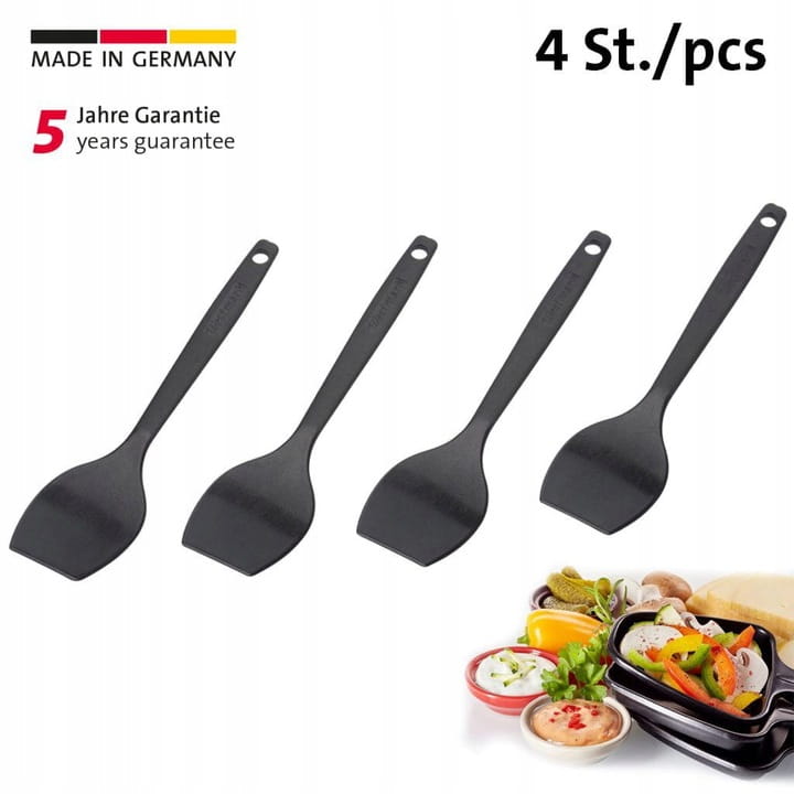 Набор из 4 скребков для раклета »Gourmetta» длиной 17 см был изготовлен из высококачественного полиамида, что гарантирует их долговечность и прочность. Набор также включает в себя 4 небольших тонких лопат, которые идеально подходят для использования в кастрюлях Raclette. Скребки устойчивы к температуре до 210 ° C, что позволяет вам безопасно использовать их во время приготовления. Благодаря его функциональности и солидной производительности, эти скребки являются незаменимым инструментом на кухне для любителей ракет.