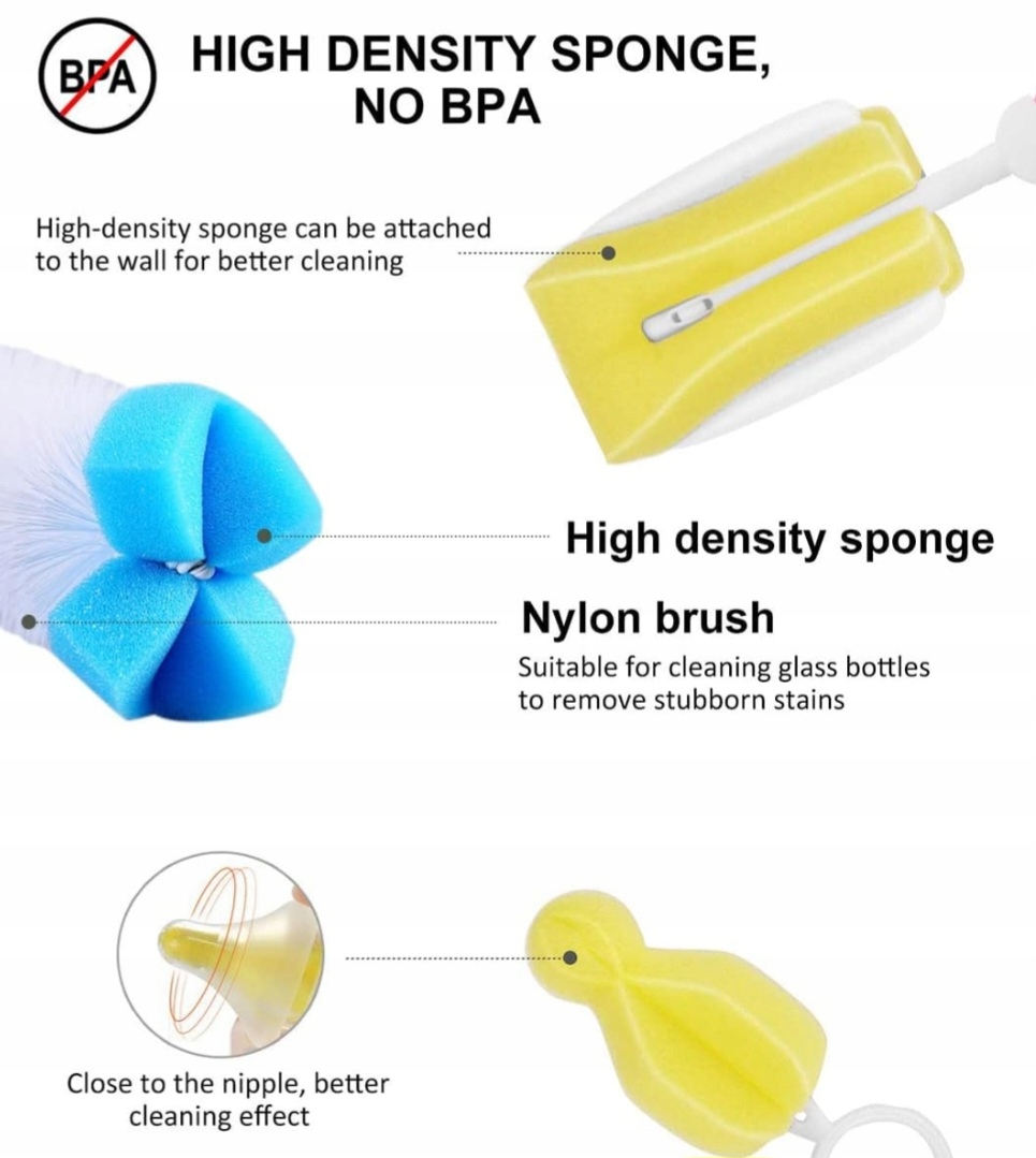 Преимущества: щетка повернута на 360 градусов и может эффективно коснуться нижней части бутылки и верхней части соски во время очистки. Эргономичный дизайн ручки помогает тщательно очистить каждую часть