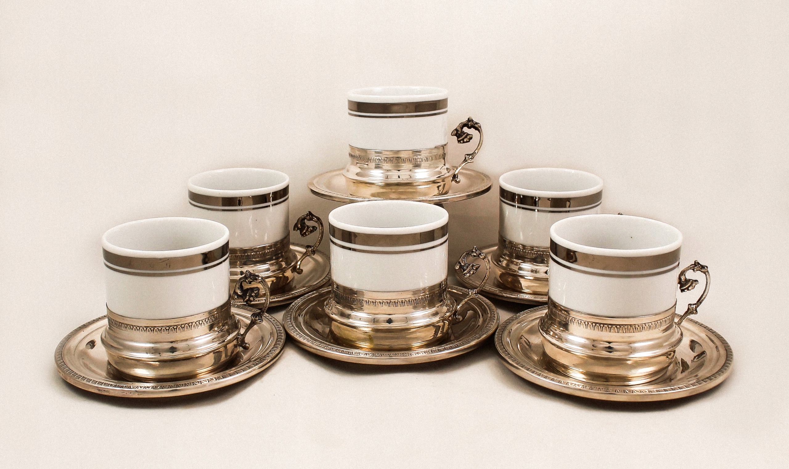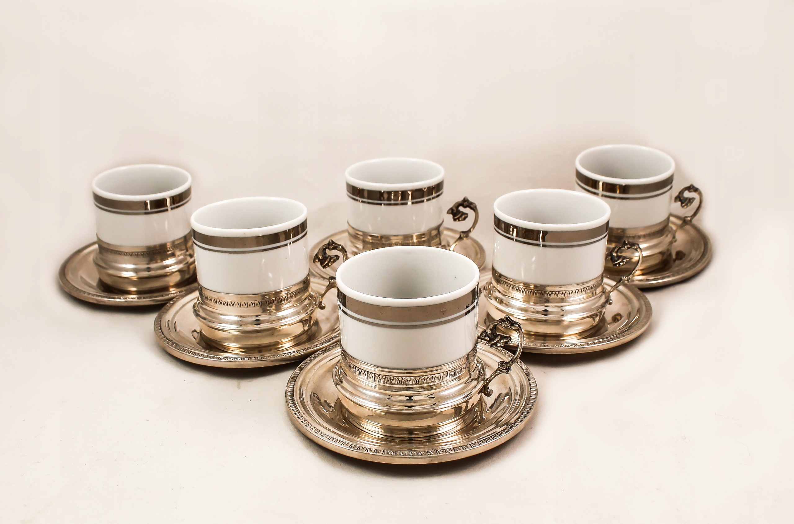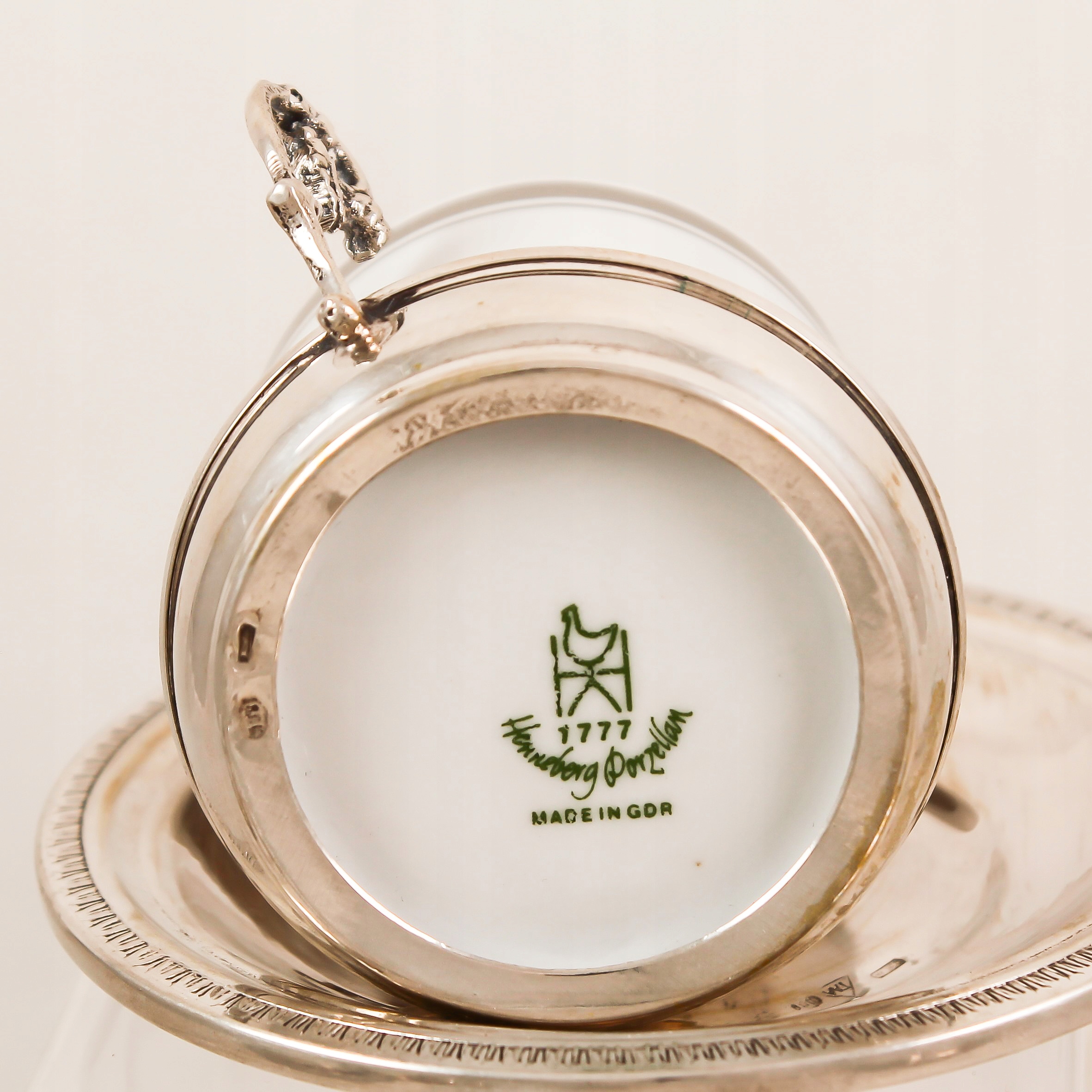 Описание: Чашки изготовлены из итальянского серебра и немецкого серебра. фарфор Henneberg с традициями, восходящими к 1777 году