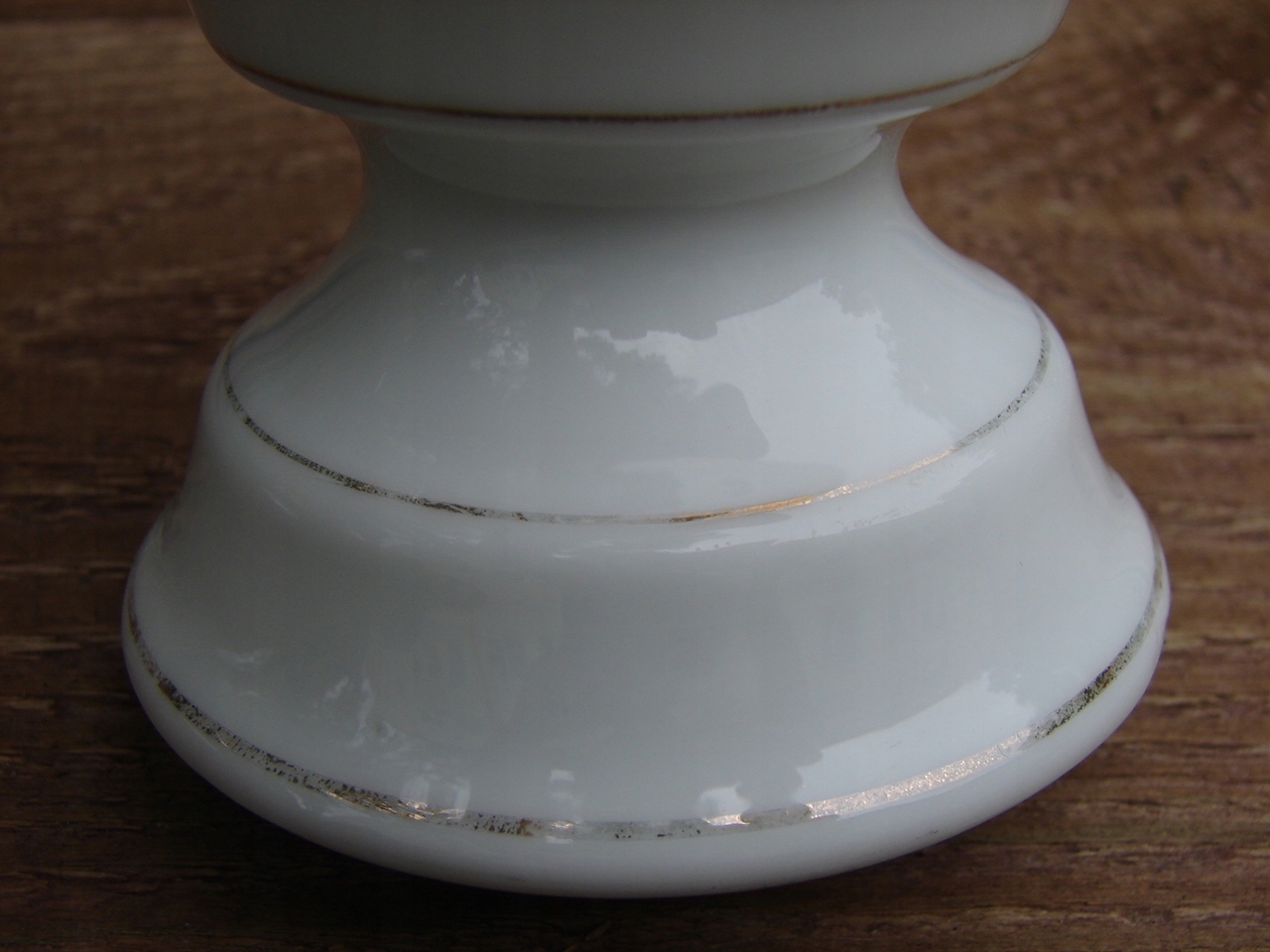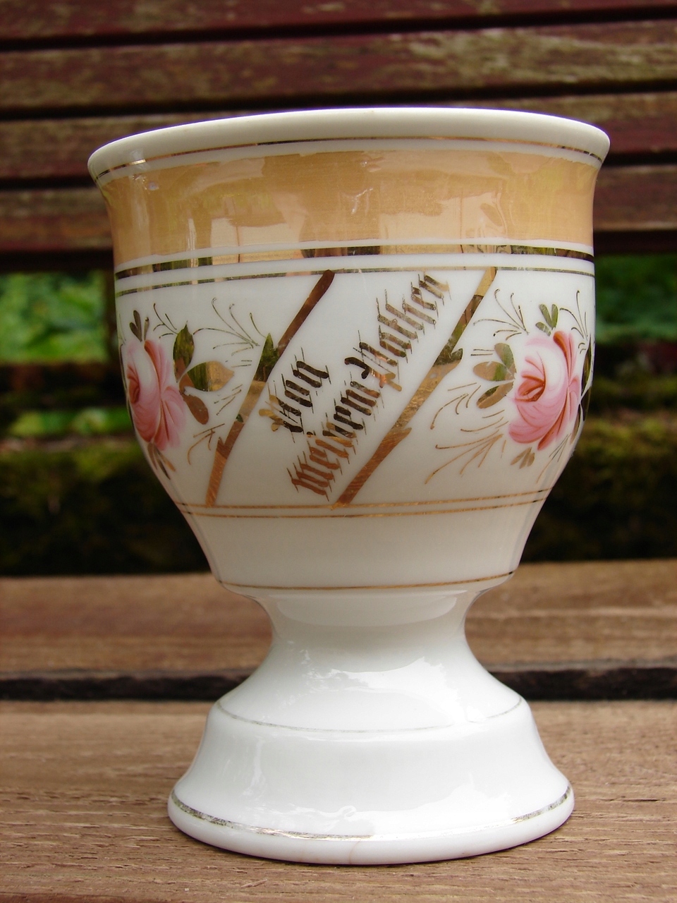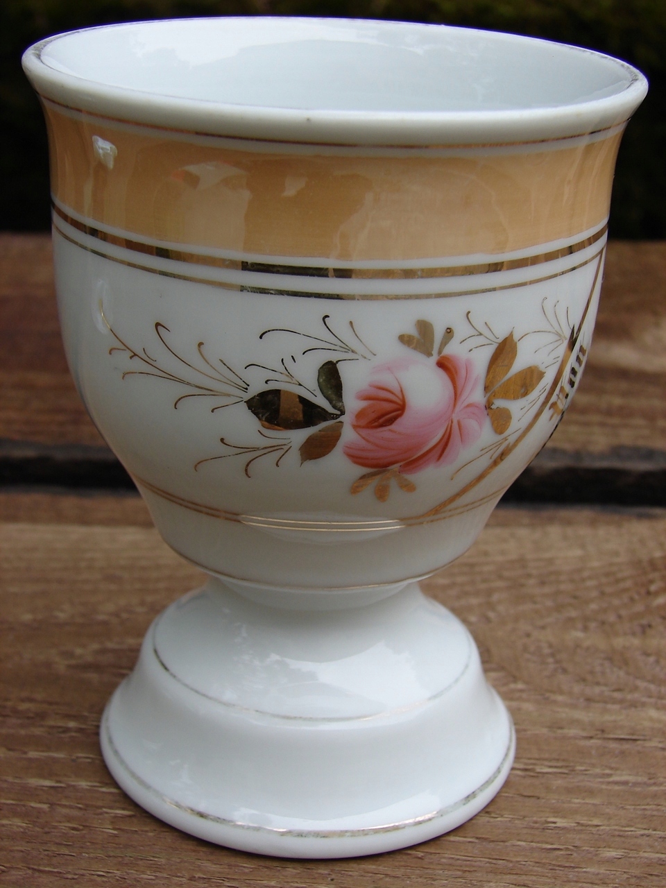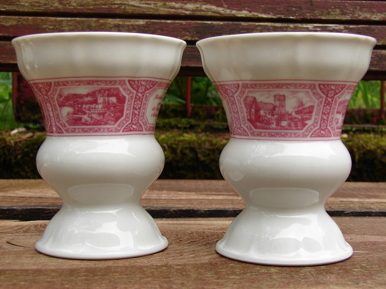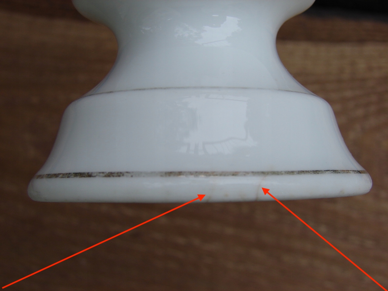 Элементы имеют следы использования и возраста в форме позолоченных ссад. Одна чашка у основания имеет два капилляра. Место таблицы в увеличении показано красной стрелкой.