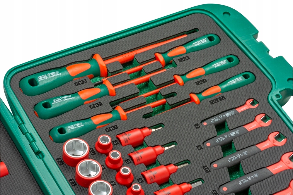Профессиональный набор из 43 изолированных ручных инструментов на 1000 В представляет собой полный комплект, предназначенный для электриков, специалистов по техническому обслуживанию и техников, работающих на установках под напряжением.