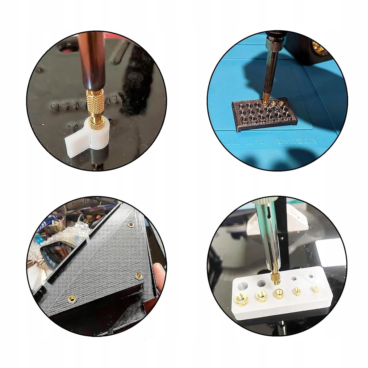 Он состоит из нескольких элементов, позволяющих вставлять вставки разных размеров. В комплект входит переходник и шесть насадок типоразмеров: M2 (M2,5), M3, M4, M5, M6 и M8. Благодаря этому набору вы сможете легко вставлять вставки в материалы разной толщины и твердости.