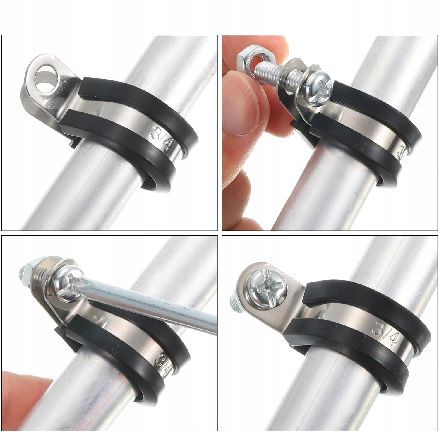 2-луночные кабельные зажимы, легко надевать и взлететь. Закрепите их в выбранном месте и прикрепите винтами, чтобы надежно прикрепить трубу к различным поверхностям, таким как стены, дерево или потолки. Пожалуйста, выберите соответствующий размер зажима трубки в соответствии с внешним диаметром трубы.