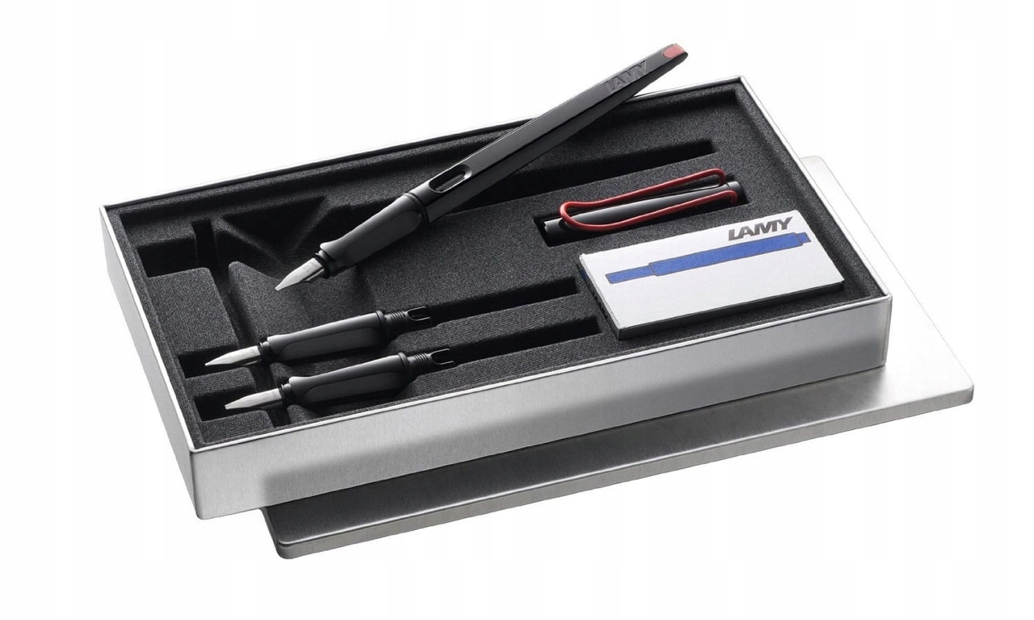 В комплект входит ручка Lamy Joy с тремя съемными передними частями с наконечниками размером 1,1 мм, 1,5 мм, 1,9 мм и упаковка картриджей Lamy T10 с черными чернилами.