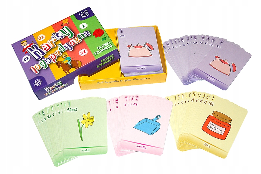«Карты речевой терапии» - это предложение, чтобы объединить веселье и науку Правильное произношение гудящих звуков : sz, ż, cz и j. Представленный набор состоит из двух колод карт речевой терапии. В этом случае цвета карты были заменены шипением.