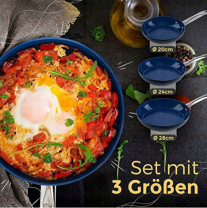 Набор сковород из литого алюминия с антипригарным покрытием из алмазной керамики. Идеально подходит для жарки и приготовления пищи без жира. Устойчивая к царапинам и долговечная, как почти никакая другая сковорода. Равномерное распределение тепла. Никакого пригорания и прилипания. Он также подходит для жарки и фламбирования. Наилучшие результаты приготовления и легкая очистка. Возможность использования в духовке до 400°С
