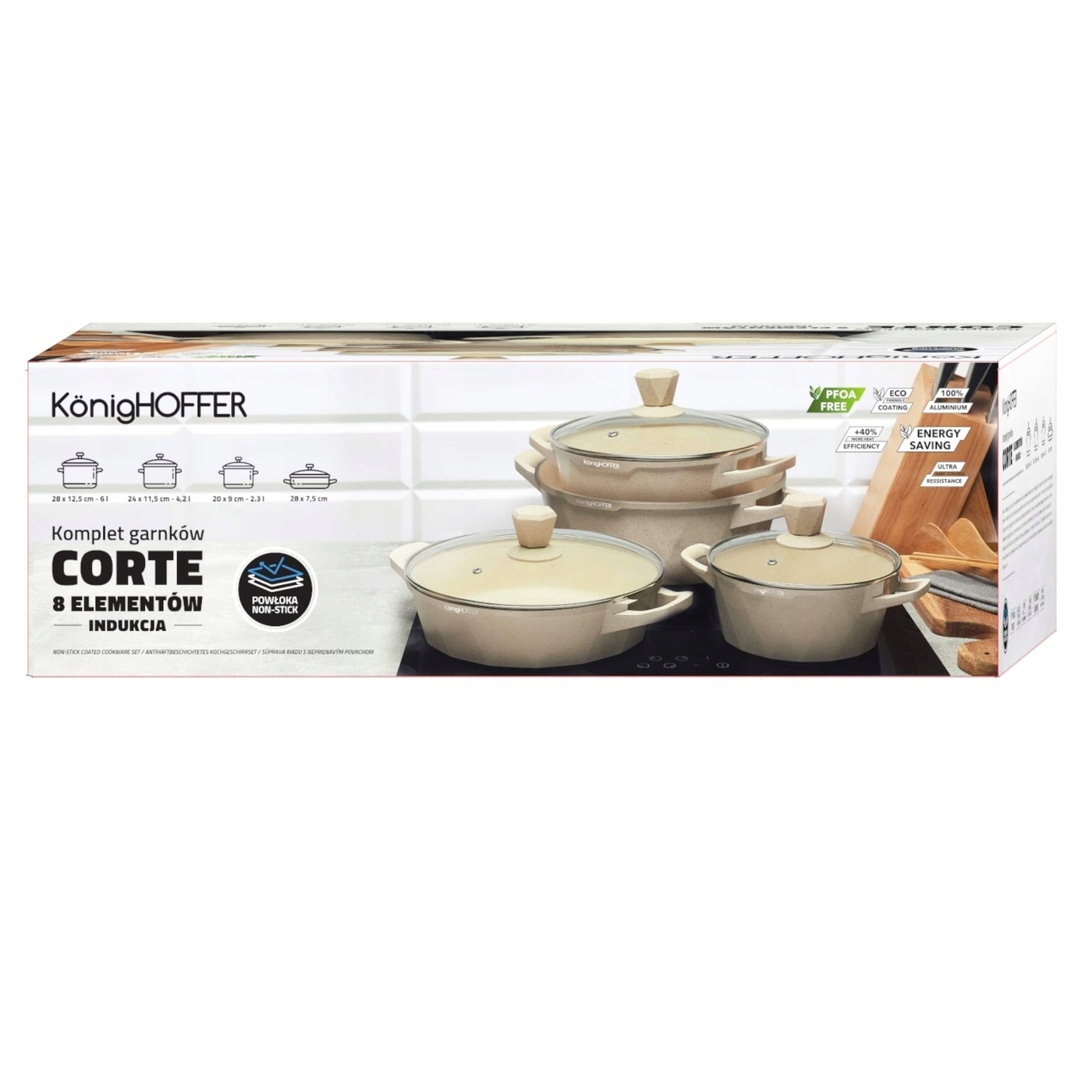 Konight Corte 8 мраморных горшков. 8 элементов будут очень хорошо работать на большой домашней кухне. Набор обеспечивает безопасную приготовление и жарку. В наборе вы найдете блюда с емкостью от 2,3 до 6 литров. Стеклянные крышки, включенные в набор, имеют стальный край, защищающий от сколовки и стильных, нежигающих мягких сенсорных ручек с нездоровой поверхностью. С набором из 3 горшка и каменной кастрюлей Corte вы можете приготовить на любом кончике плиты. Элегантность добавляется гранитным нежичным покрытием Marble Plus и отделкой алюминиевых тел, стилизованных как сливочный мрамор. Двухслойная структура покрытия с неприемника выдержит до 5000 циклов истирания. Они быстро нагреваются, поэтому вы сэкономите время и энергию. Они великолепны на семейной кухне или в подарок. Они также хорошо защищены от высокой температуры и равномерно проводят тепло. У вас также есть возможность использовать их в духовке (максимум при 220 градусах C), если вы удалите крышку. PFOA Free -это обозначение их безопасности и неоксической структуры для окружающей среды. Ручки актеров являются неотъемлемой частью тела сосуда. Из -за того, что у них нет дополнительных суставов, они нагреваются вместе с горшками и кастрюлем. Это означает, что при переносе и снятии духовки и удалении из духовки необходимо использовать защитные (материал, силиконовый) или кухонные перчатки, чтобы избежать ожогов.