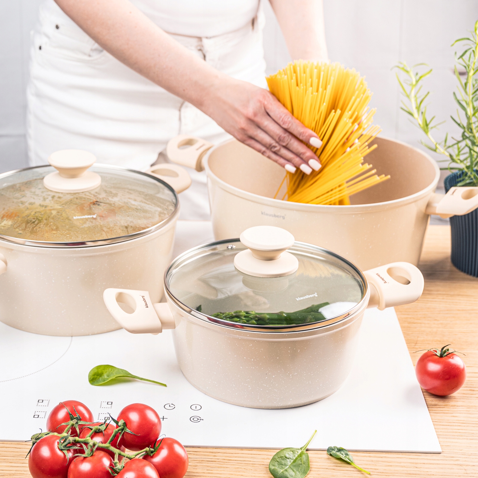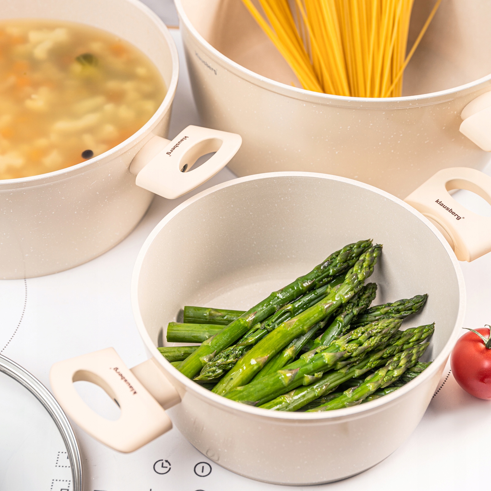Материал: литой алюминий, антипригарное мраморное покрытие, индукционное дно, крышки - закаленное стекло с вентиляционным отверстием, ручки soft-touch.