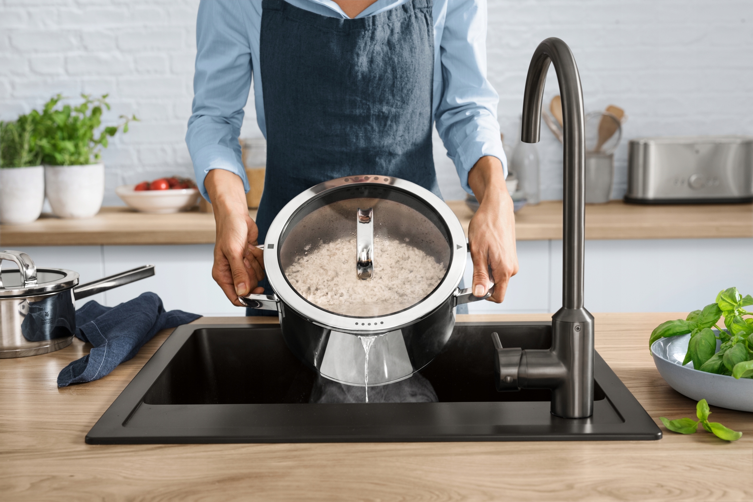 Силикон, используемый в кастрюлях WMF, термостойкий. Крышки можно использовать в духовке при температуре до 180 градусов.