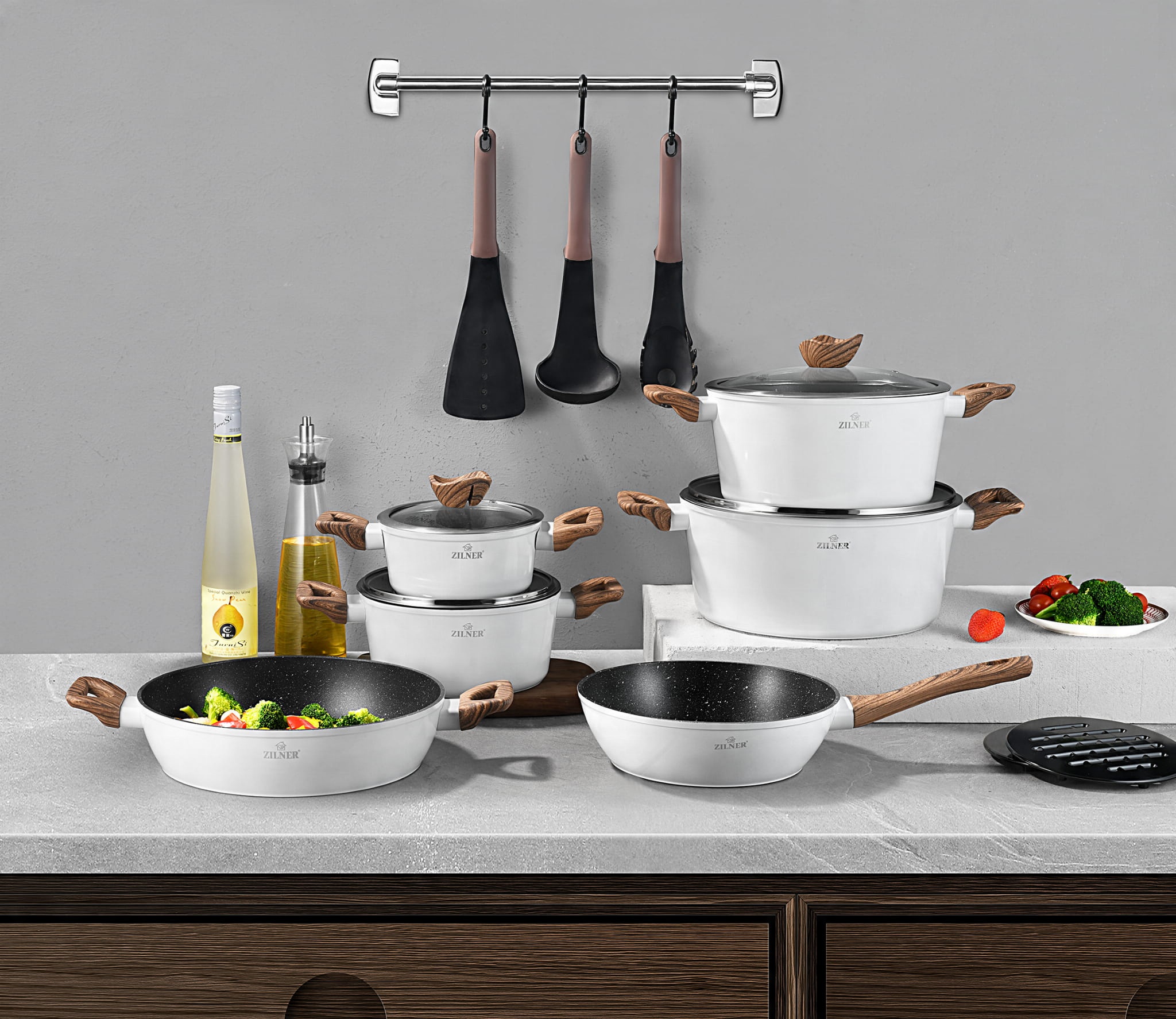 Набор ZILNER ZL-8515 из 15 предметов – это прежде всего элегантный и современный набор кухонной утвари. Белый цвет, деревянные элементы и точная обработка позволят изменить любой кухонный интерьер. Он создает роскошную атмосферу, придает авангардный характер и легко вписывается в различные композиции. Набор из 15 предметов ZILNER ZL-8515 состоит из четырех < б>кастрюли со стеклянными крышками, две сковороды, две салфетки устойчивые к высоким температурам и функциональная кухонная утварь. Все ручки изготовлены из прочного материала. и устойчивый к высоким температурам материал, защищающий руки пользователей.