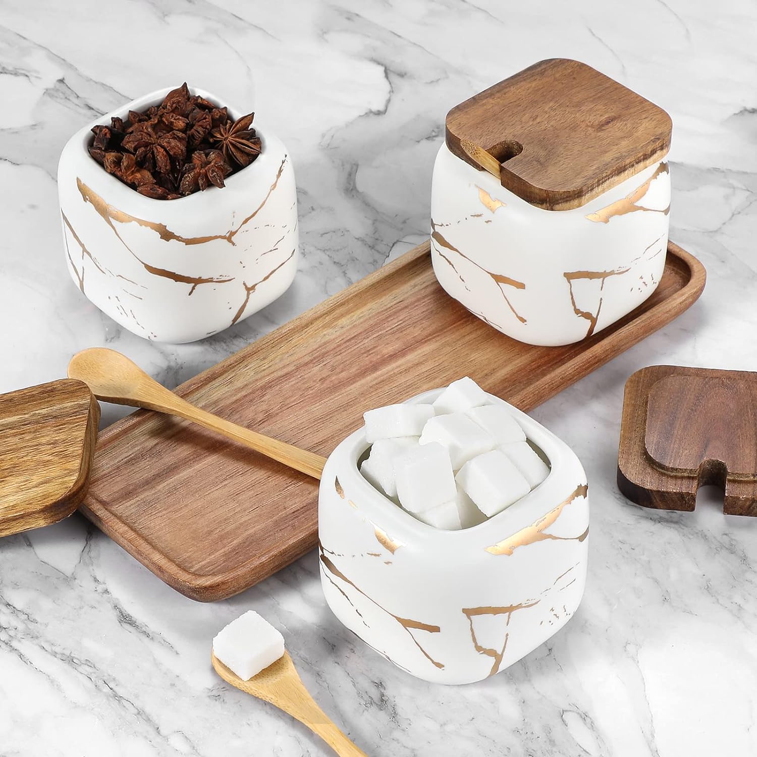 В комплект входят 3 керамические банки, 1 бамбуковый поднос, 3 бамбуковые крышки и 3 бамбуковые ложки.