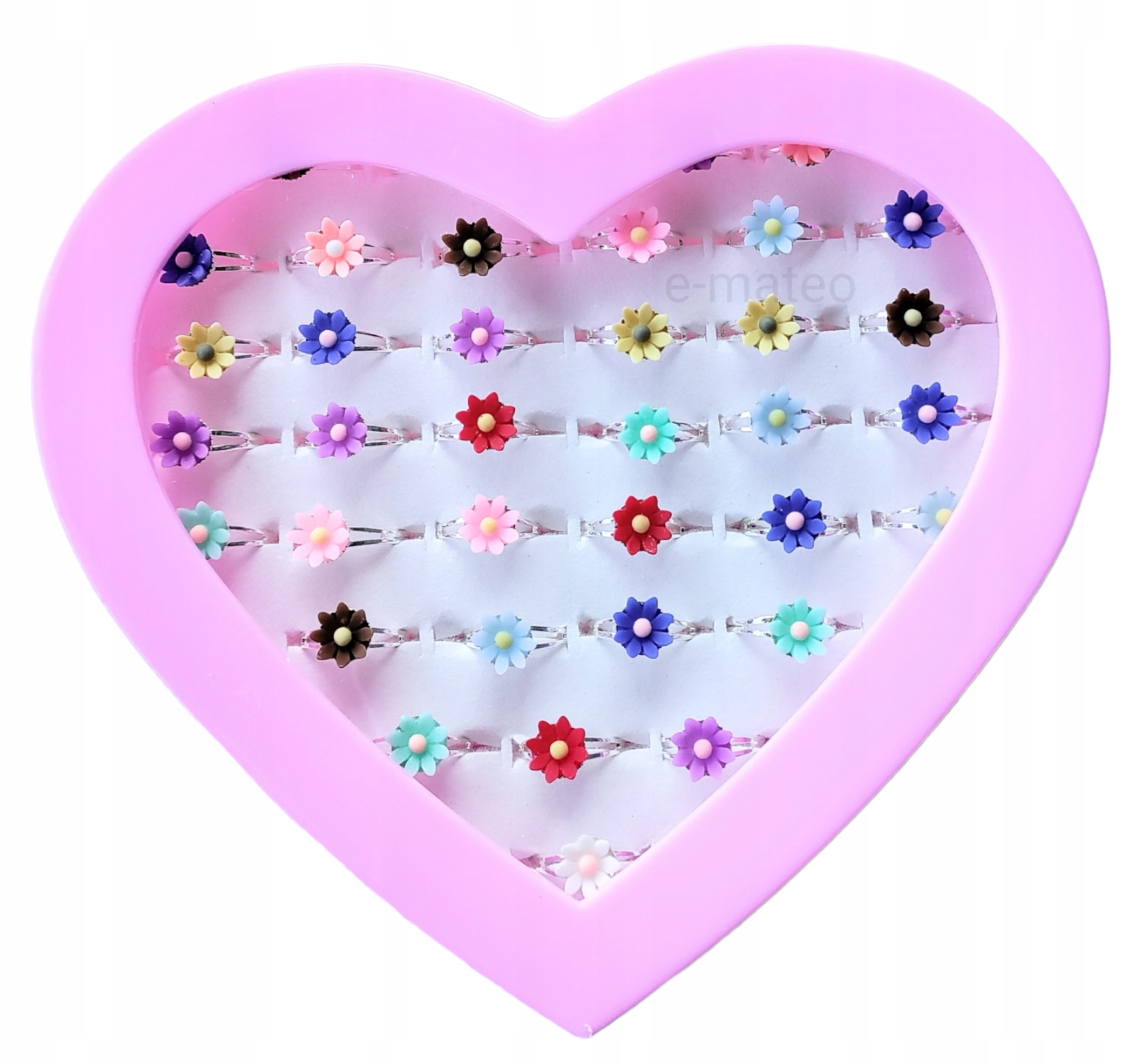 - 36 колец с блестящими элементами помещены в коробочку в форме сердца.
