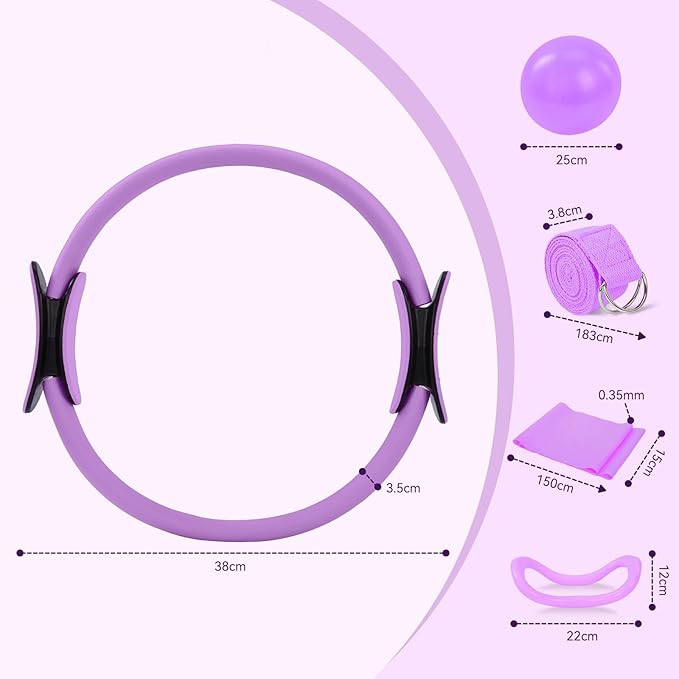 🧘 ♀ В комплект входит 1 кольцо для пилатеса, 1 кольцо для йоги, 1 ремень для йоги, 1 эспандер и 1 мяч для йоги, отвечающие всем вашим потребностям.