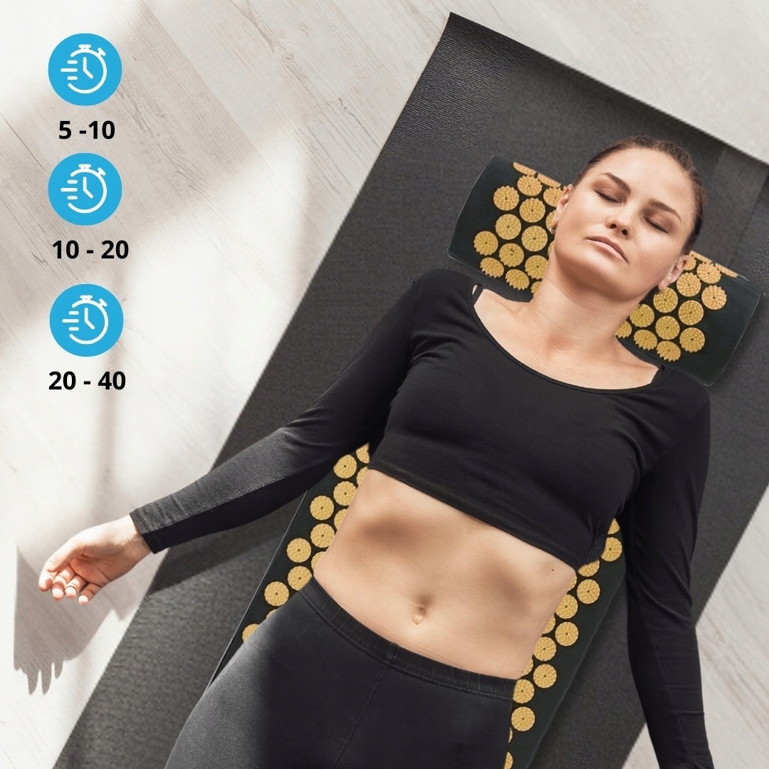 Чтобы использовать коврик для акупрессуры, поместите его на ровную поверхность — предпочтительно на пол или мягкий ковер. Аккуратно лягте на коврик, чтобы шипы могли равномерно стимулировать точки акупрессуры на спине или других частях тела. Вы можете начать с более коротких занятий продолжительностью несколько минут, затем от 10 до 15 минут, постепенно увеличивая время до 30 минут. Для большего комфорта новички могут положить на коврик тонкий материал или одежду. Используйте входящую в комплект подушку под шею, чтобы расслабить мышцы шеи и снять напряжение.