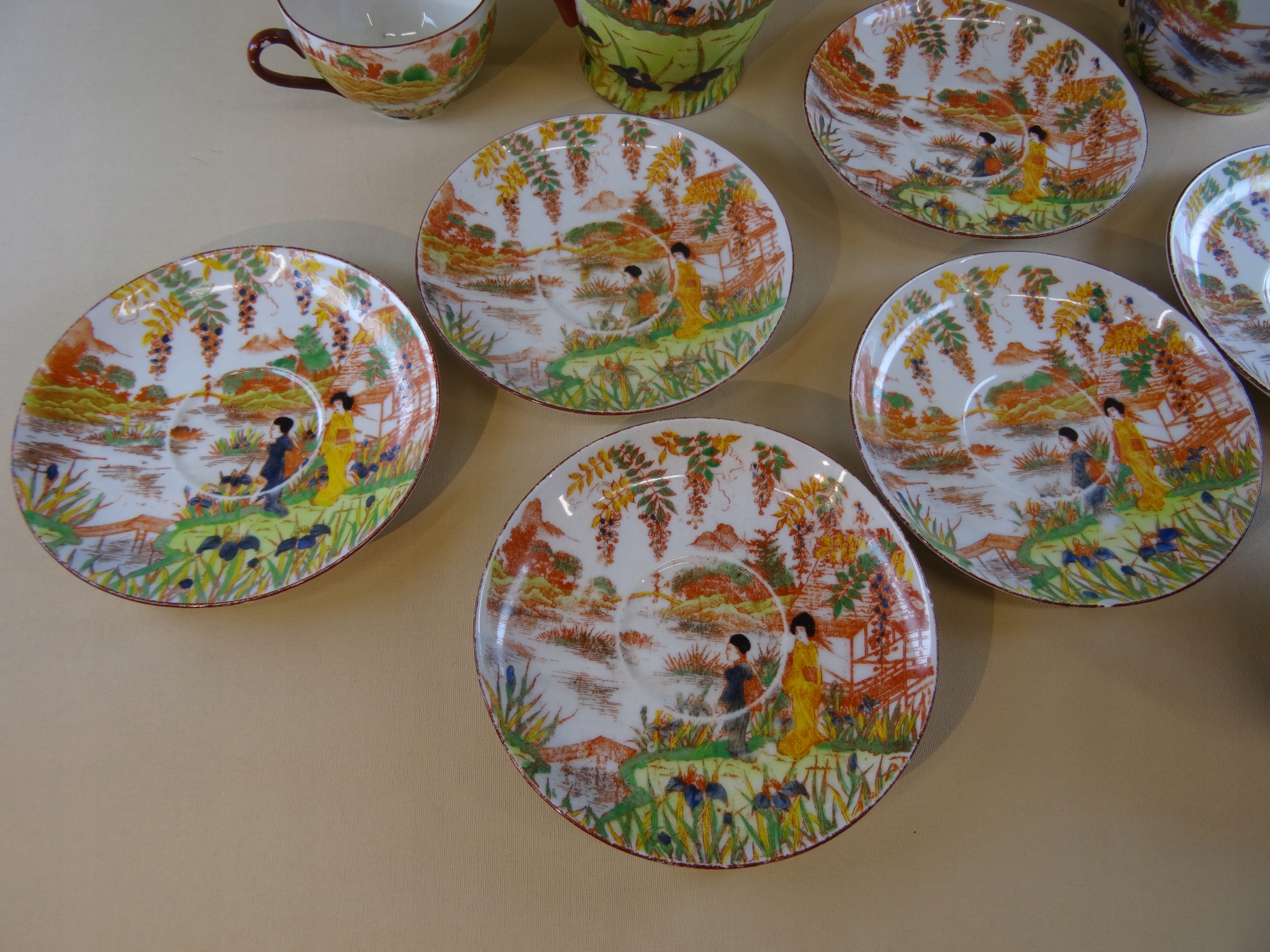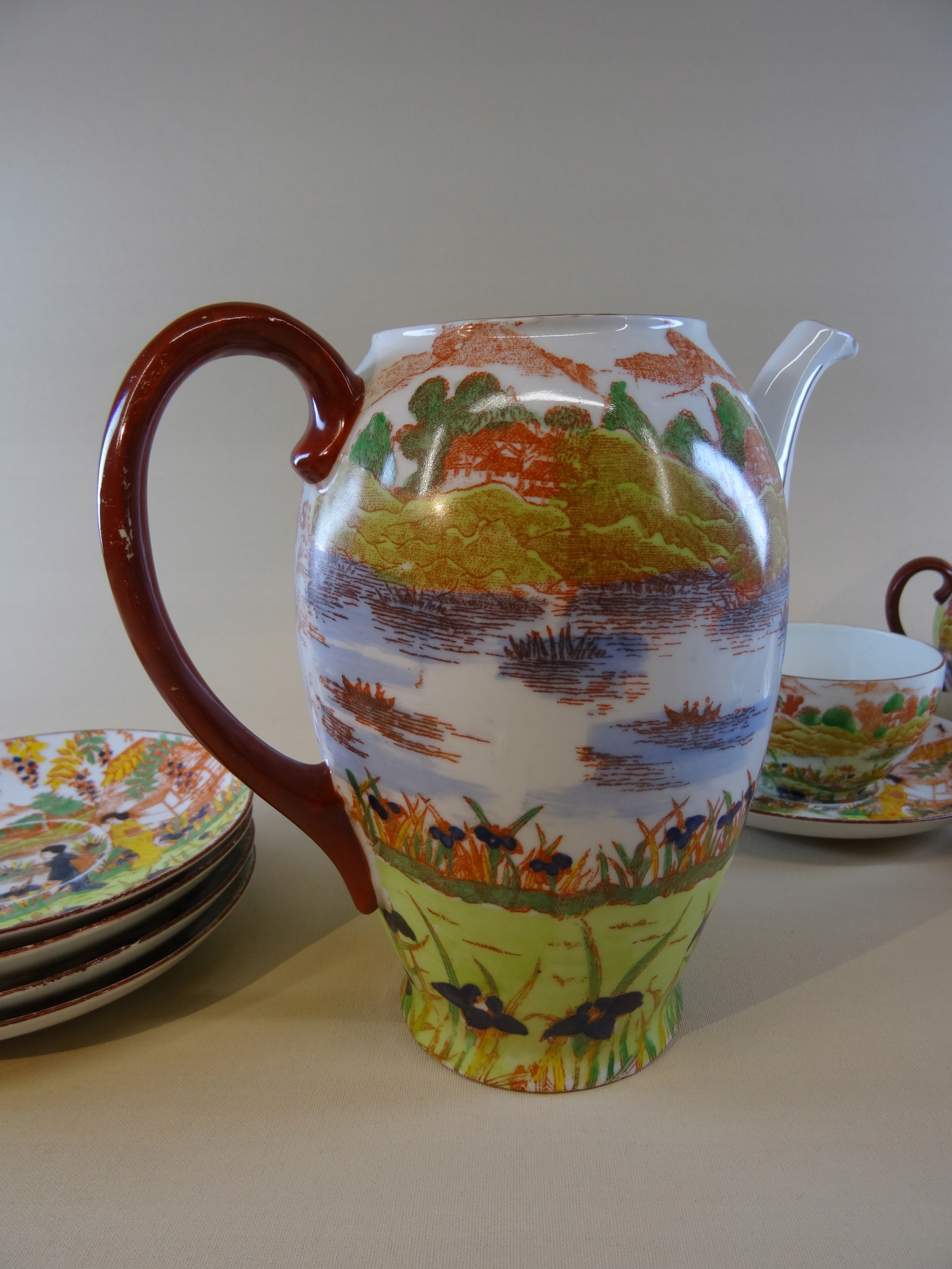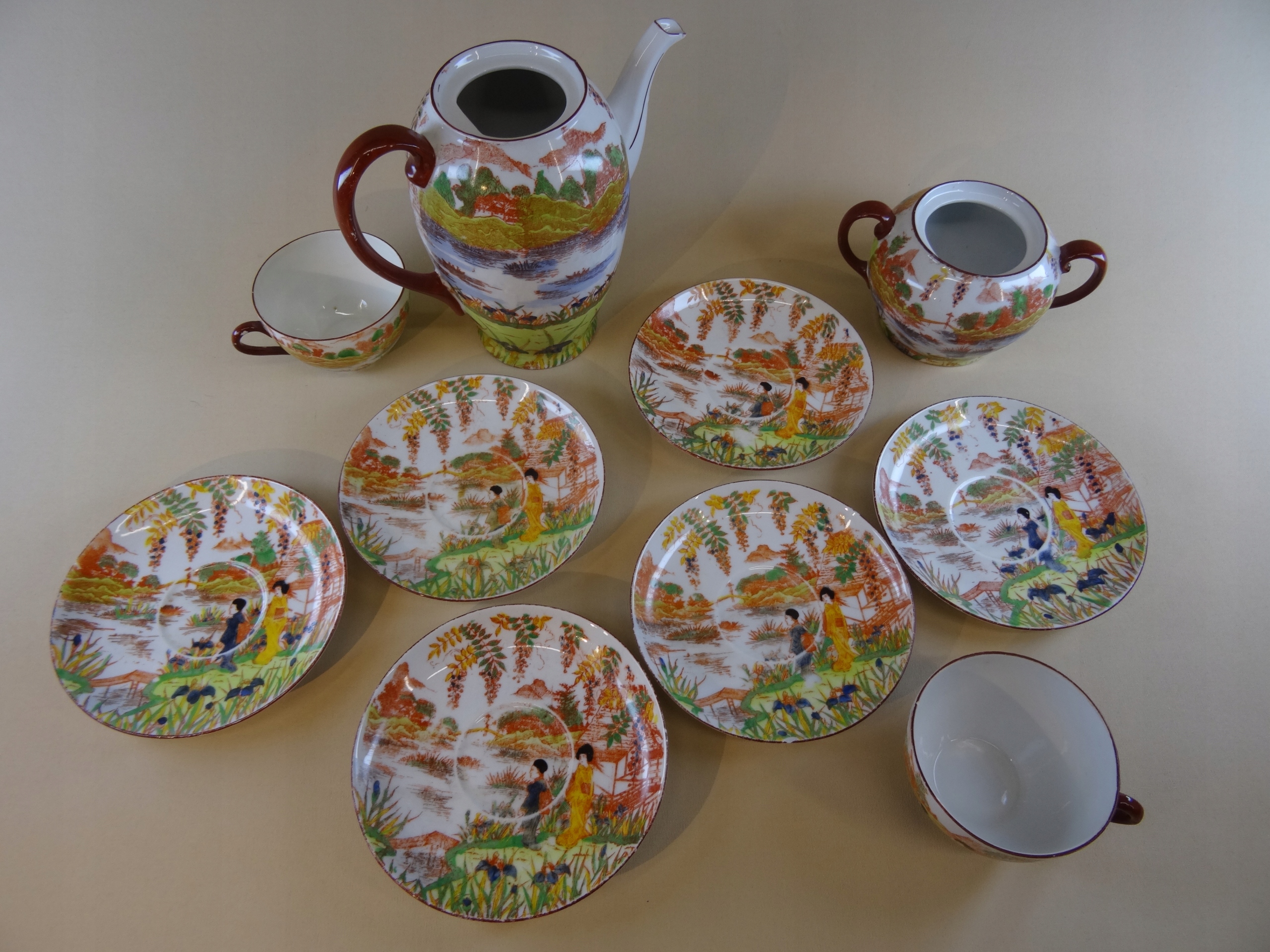 Состояние: б/у, без недостающих деталей и следов использования; отсутствие крышек на чайнике и сахарнице, видимые потертости - особенно на чашах тарелок, незначительные повреждения керамики на носике чайника и краю тарелки. Состояние как на фотографиях.
