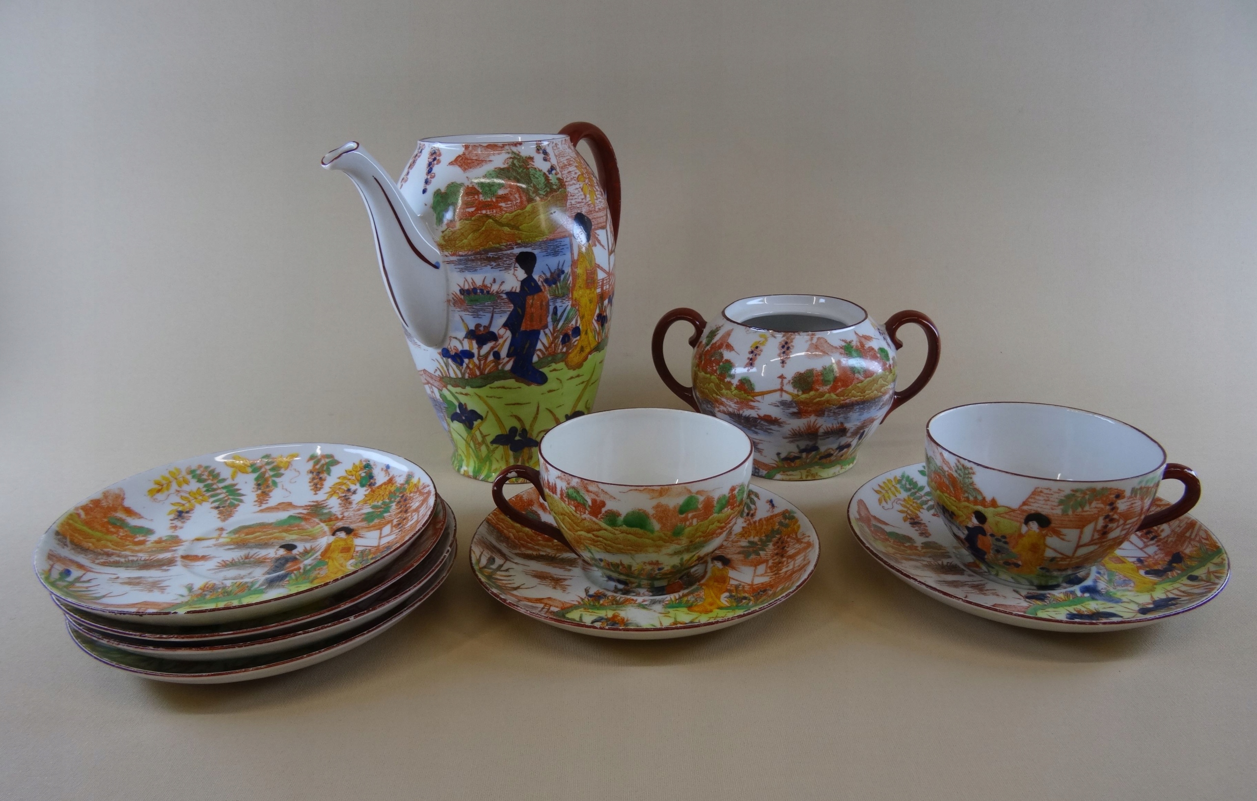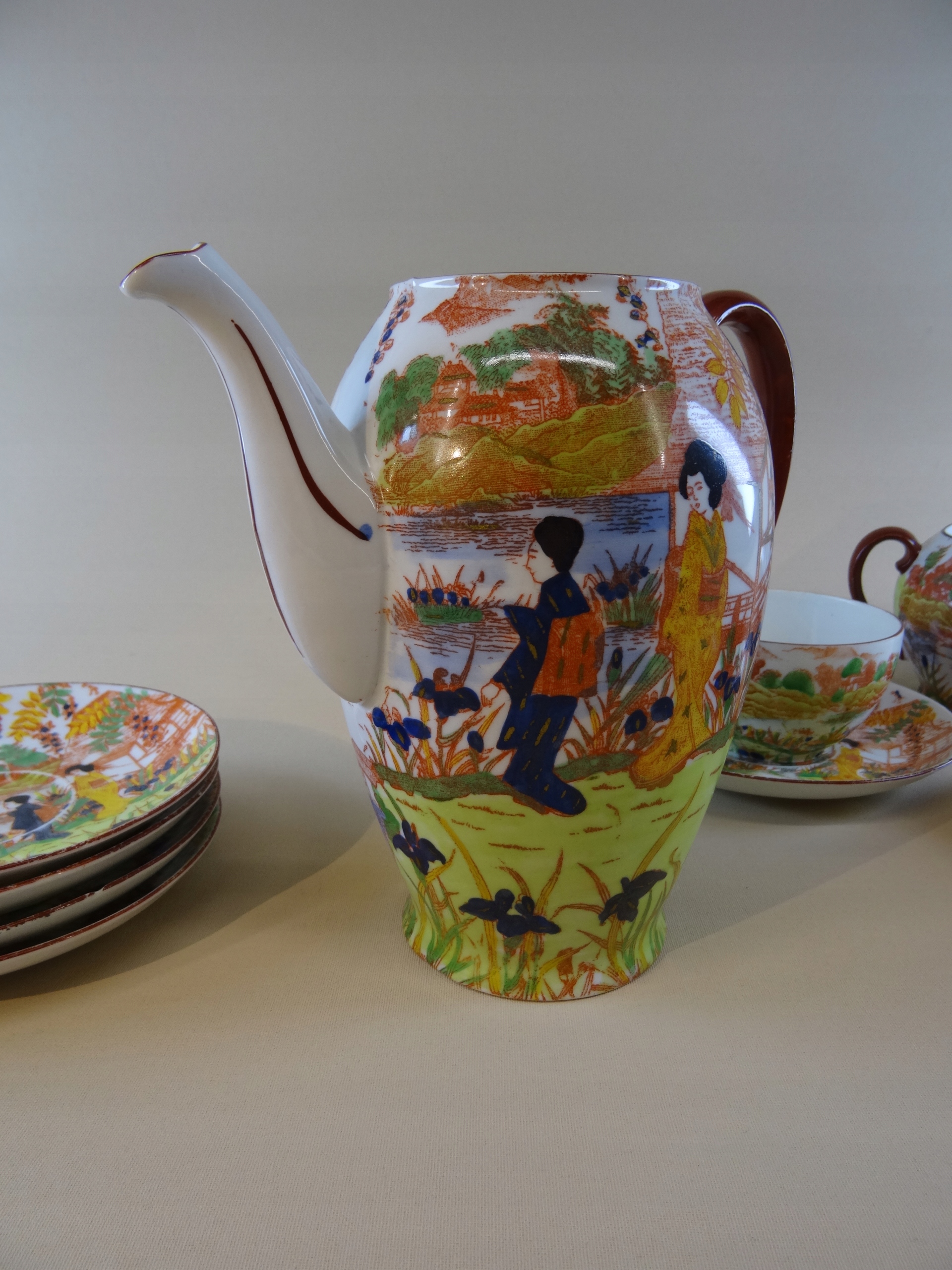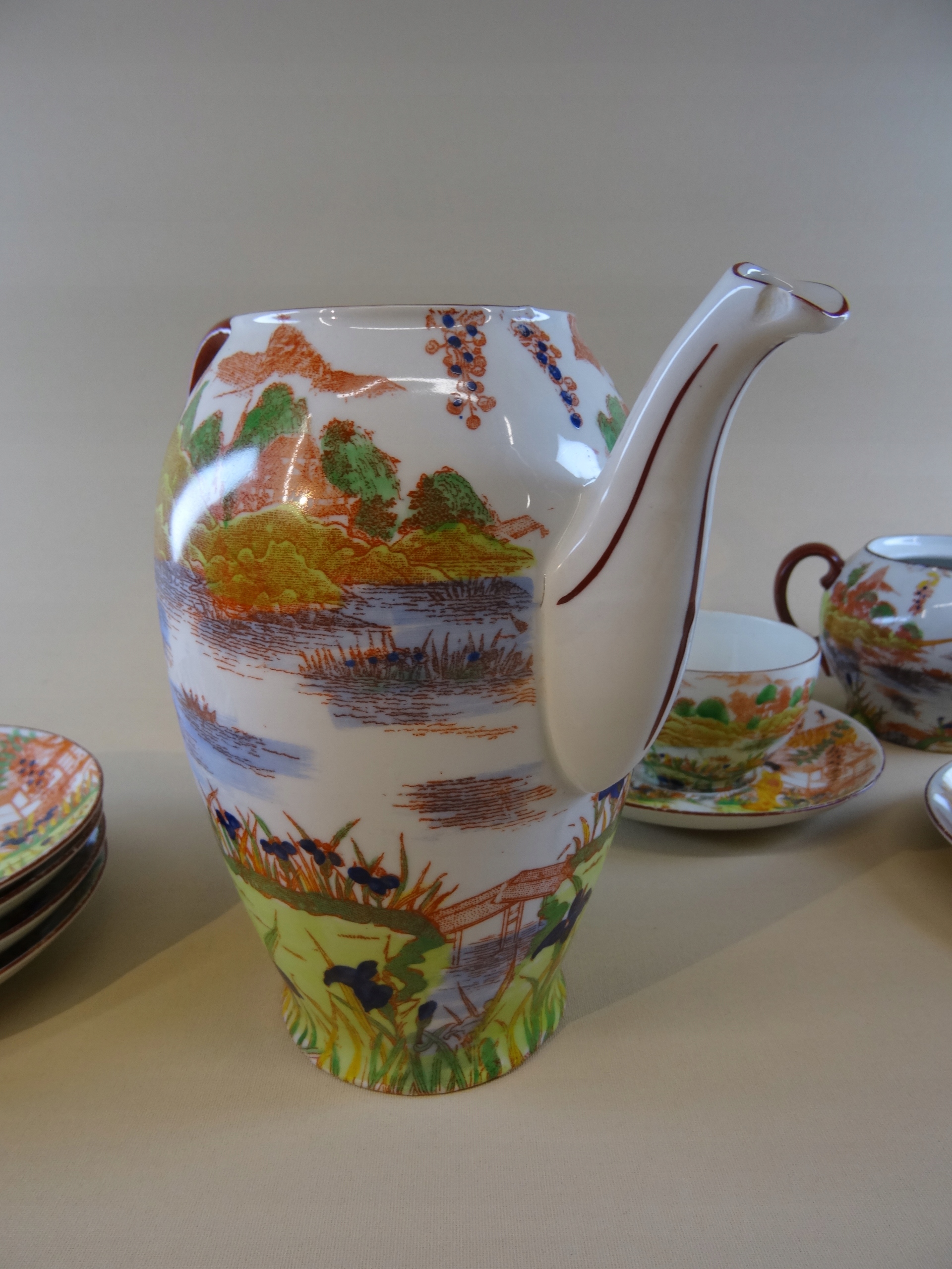 Состояние: б/у, без недостающих деталей и следов использования; отсутствие крышек на чайнике и сахарнице, видимые потертости - особенно на чашах тарелок, незначительные повреждения керамики на носике чайника и краю тарелки. Состояние как на фотографиях.