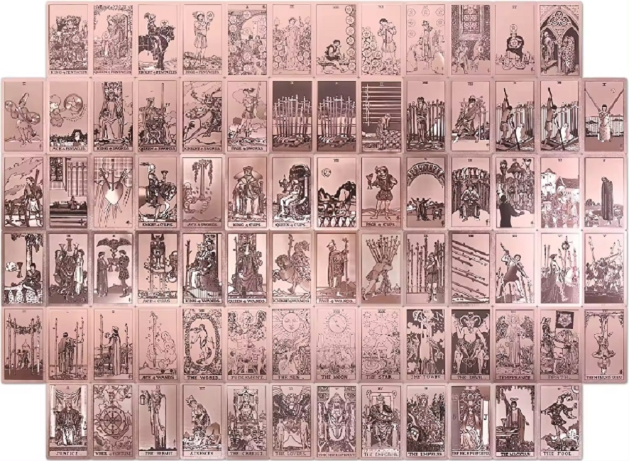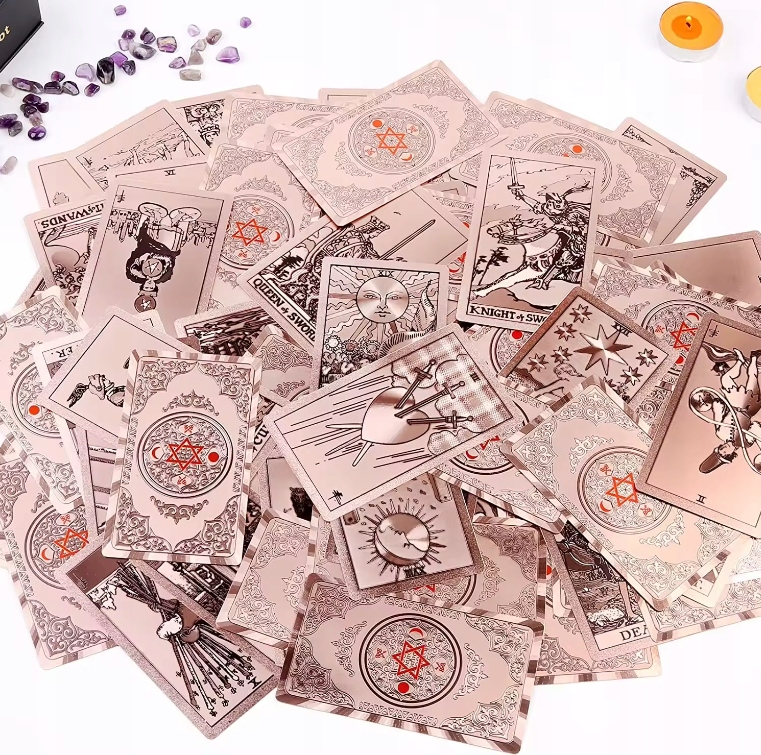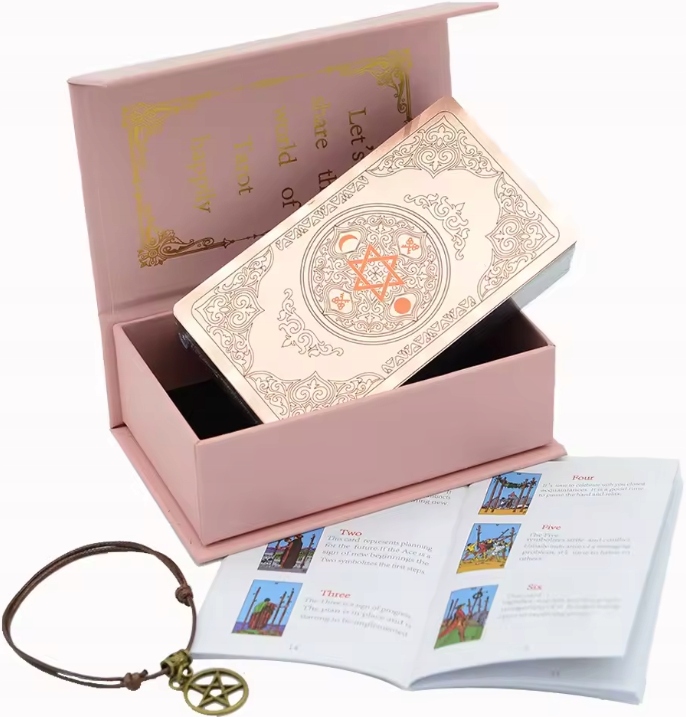 Новые карты Таро в розовом золоте - это Perfect b> для любителей эзотерического искусства. Эта мистическая колода карт сочетает в себе необычайную гармонию цветов само по себе, подчеркивая красоту и тайну сообщения, содержащиеся на отдельных картах. Чрезвычайно тщательно детали с золотыми мотивами добавляют роскошные характеристики к уникальному продукту .