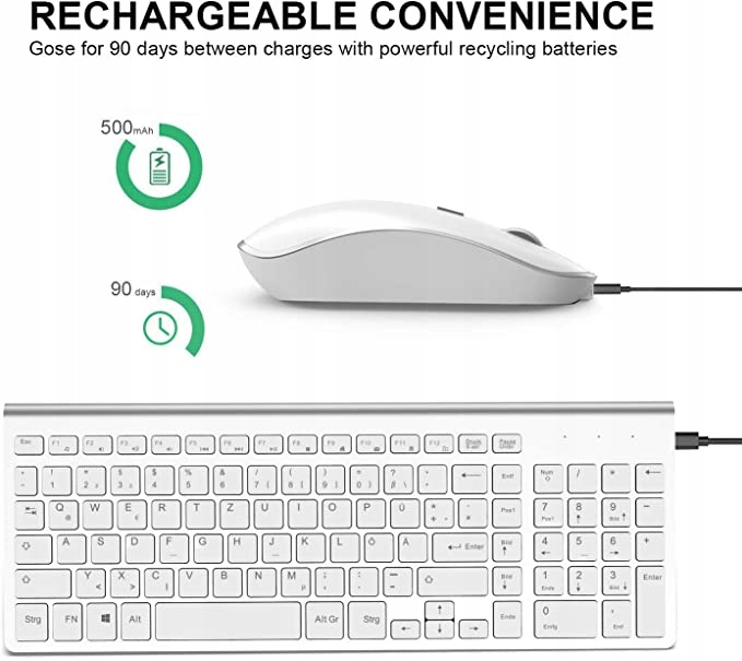 - Экономия батареи и энергии-с клавиатурой и мышью оснащены встроенной литий-ионной батареей 500 мАч и обеспечивают до 60 дней беспроводного рабочего времени и 90 дней для беспроводной клавиатуры с полной зарядкой. Полная зарядка длится всего около 1,5 часов. Оба устройства входят в спящий режим в отсутствие активности и переоцениваются коротким движением. Аккумулятор не находится в рамках доставки.