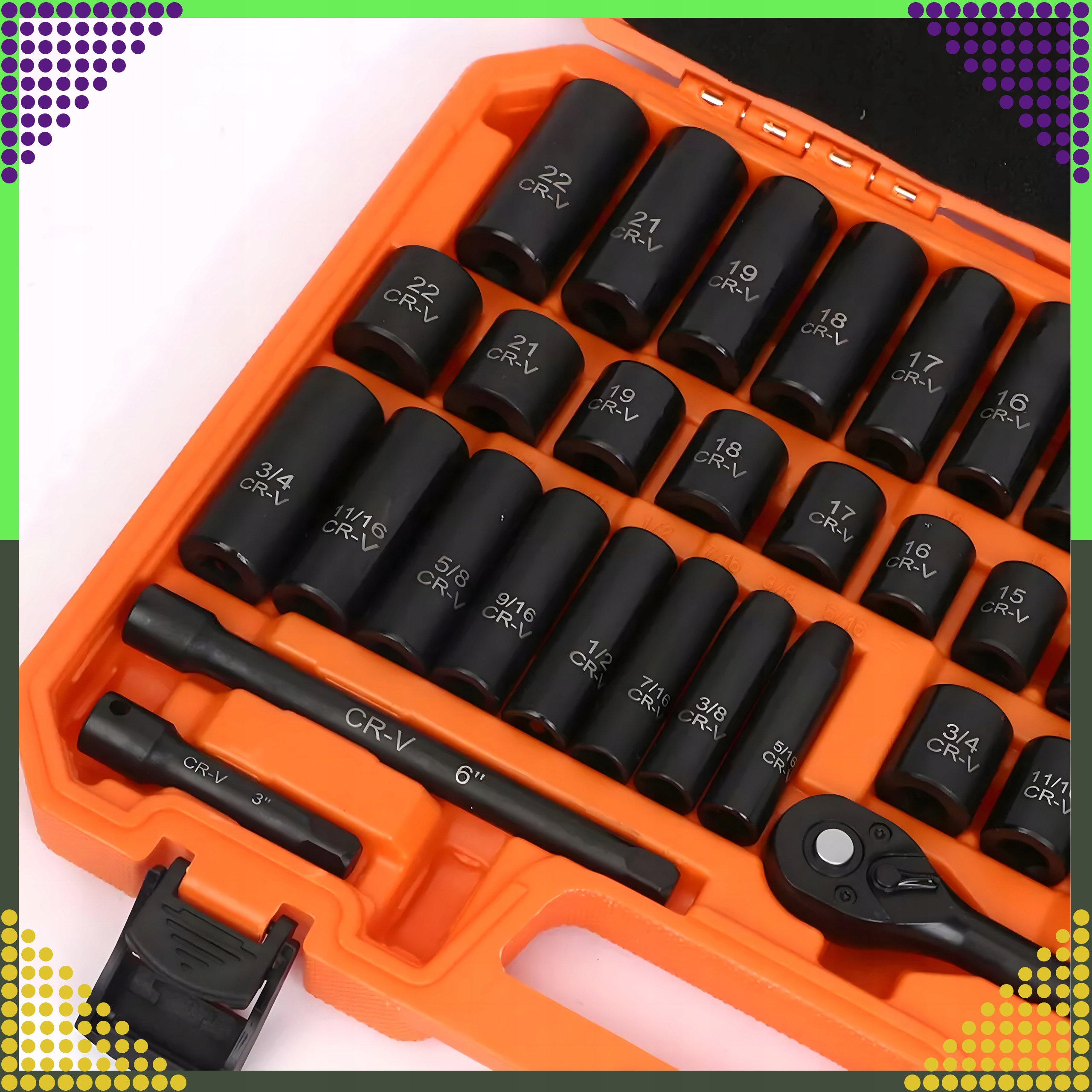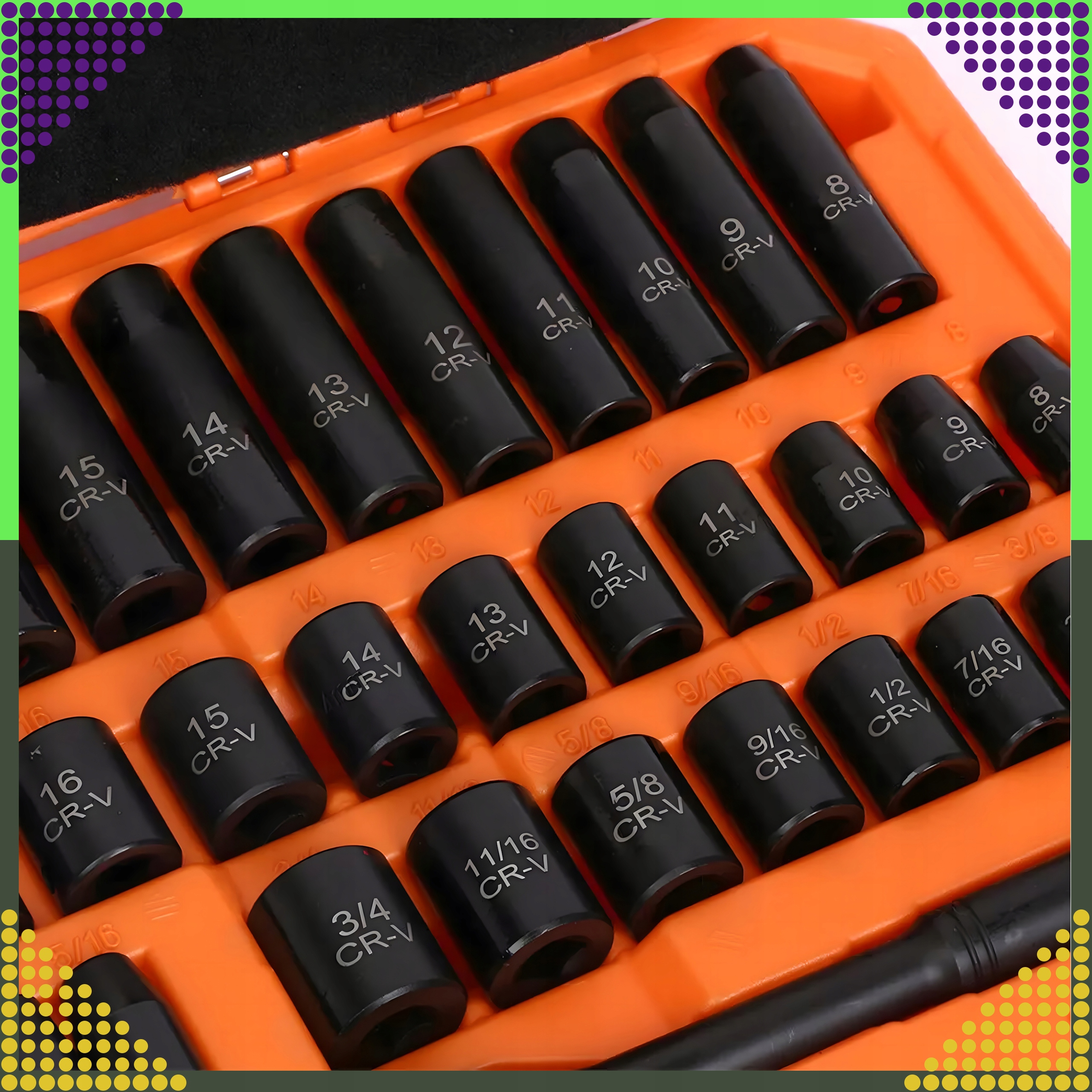 ✔ Размер колпачков в наборе (SAE Flat): 5/16, 3/8, 7/16, 1/2, 9/16, 5/8, 11/4, 3/4 дюйма