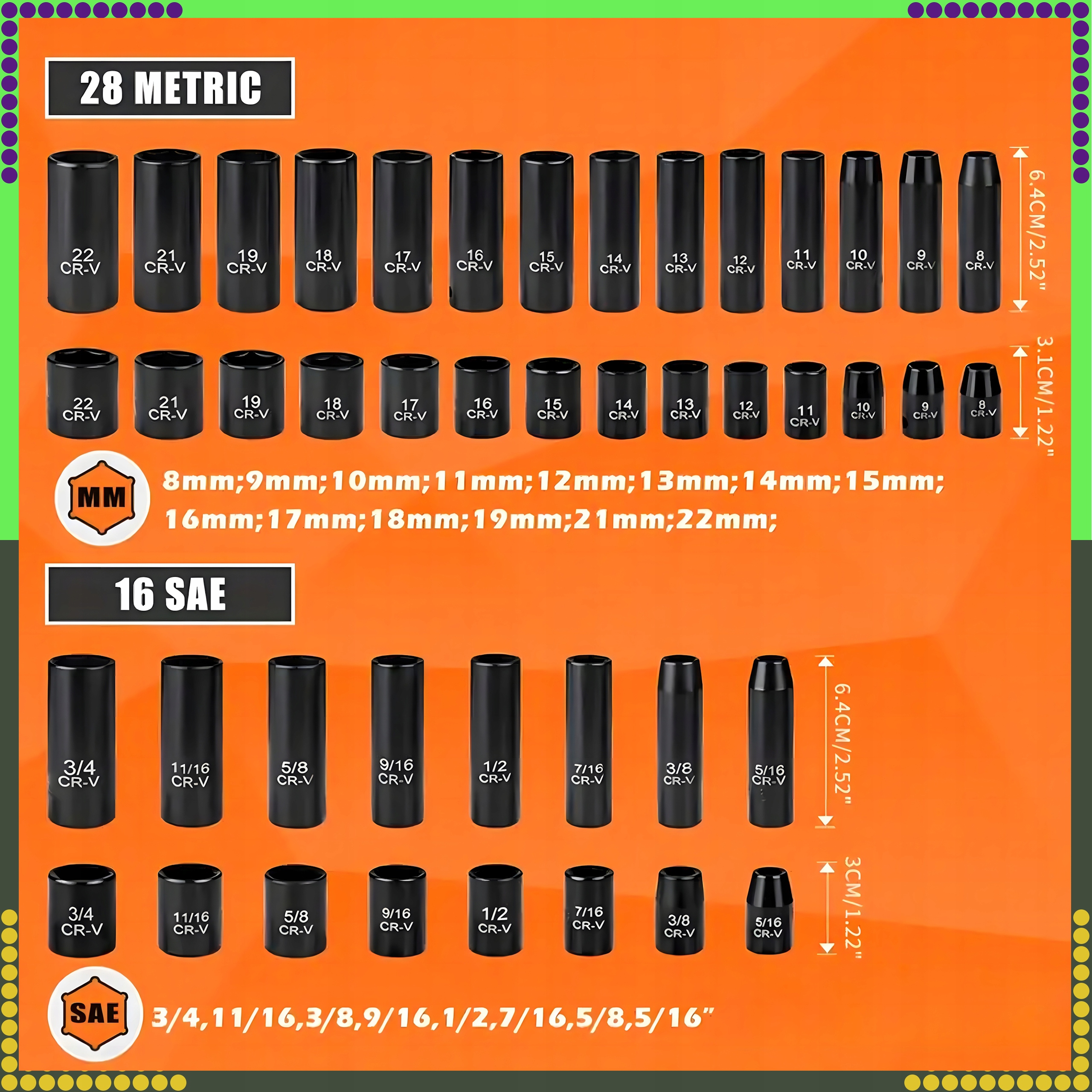 ✔️ Says of the caps in the set (deep): 8, 9, 9, 9, 9, 9, 9, 9, 9, 10, 11, 12, 13, 14, 15, 16, 17, 18, 19, 21, 22 mm,