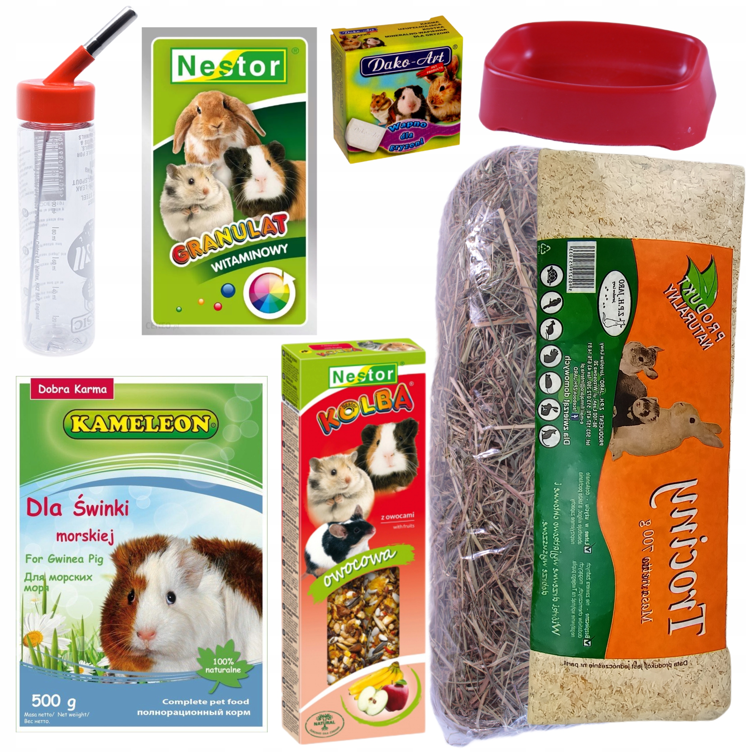 НАБОР ДЛЯ КЛЕТКИ ДЛЯ МОРСКИХ СВИНОК КОРМ ПОЧАСЫ ПИЛА СЕНО ИЗВЕСТЬ ВИТАМИНЫ ДЛЯ ВОДЫ СТАРТОВЫЙ НАБОР