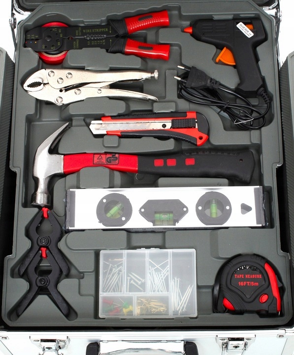 гаечные ключи рожковые, торцевые, трещотку, молоток, набор плоскогубцев, уровни, струбцины, рулетку, изоляционная лента, нож, набор гвоздей и шурупов, а также отвертки и биты.