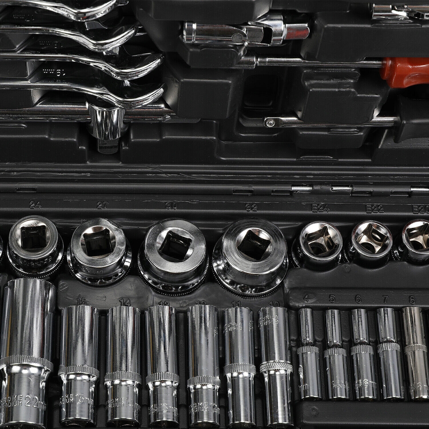- Ключи рожковые комбинированные (12 шт.): Полный набор от 8 мм до 19 мм.