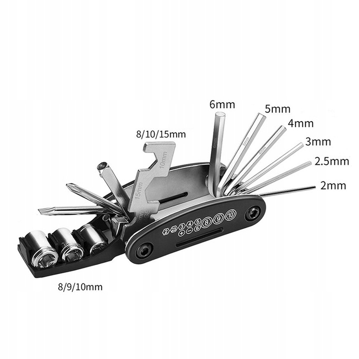- 16 функций, поскольку ключ имеет все наиболее популярные типы ключей, используемых для обслуживания велосипедов.