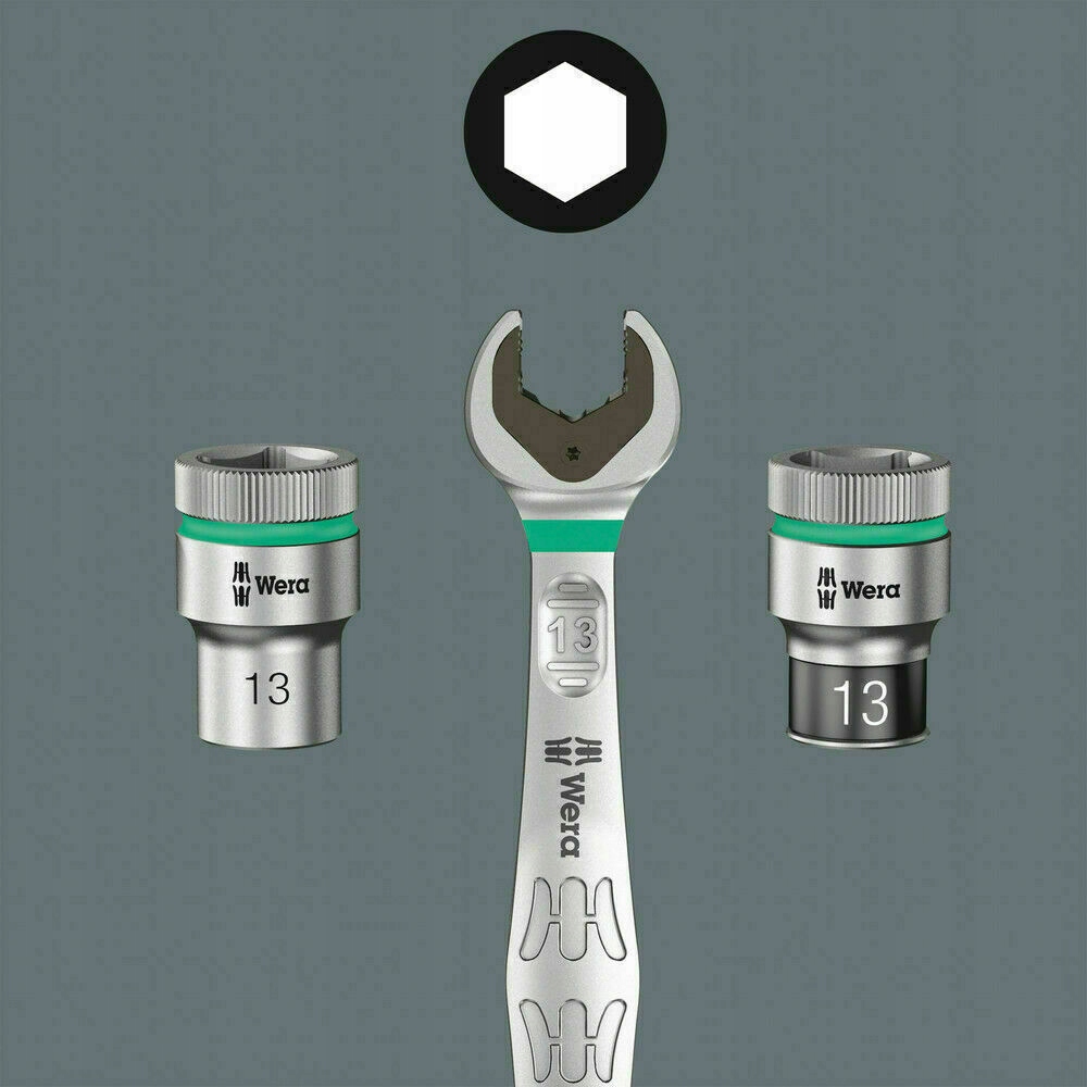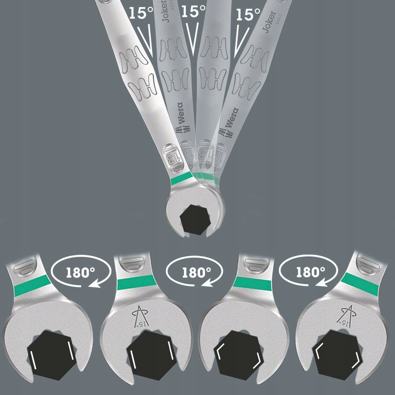 - Накидной ключ Joker 6003 со специальной геометрией губок благодаря открытой стороне, наклоненной на 7,5°, и двойной шестигранной геометрии удваивает возможность удержания инструмента при нескольких повторных поворотах на 180° вокруг продольной оси. Каждые 15° вы можете размещать инструмент на головке гайки или болта. Joker 6003 автоматически находит подходящую точку опоры после каждого поворота.