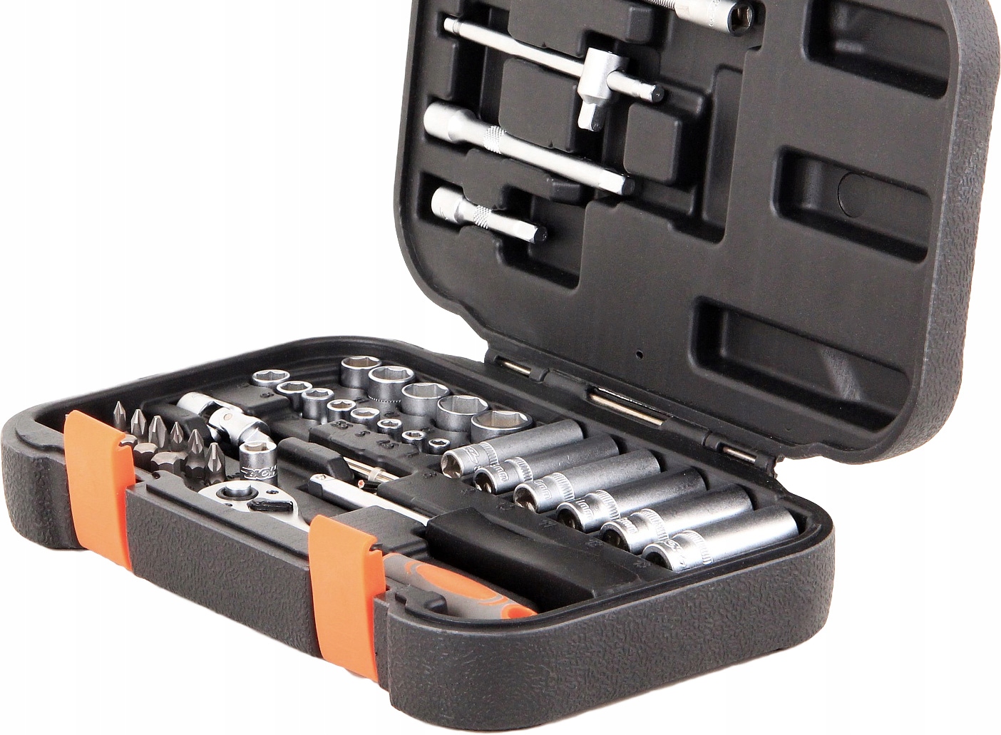 В комплект входит полный набор головок 1/4, удлинителей, кардана и многих других элементов, в том числе трещотки на 45 зубьев. Такая конфигурация делает набор пригодным для мелких сборочных работ, механического ремонта и многих других работ в доме или мастерской.