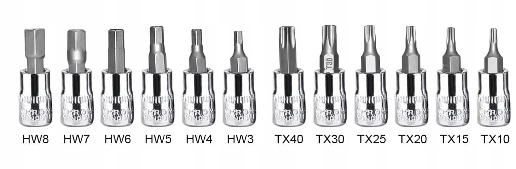 В комплект входит богатый набор торцевых головок. b> (размерами от 4 до 14 мм) и отвертки (плоские, крестовые, шестигранные, Torx).