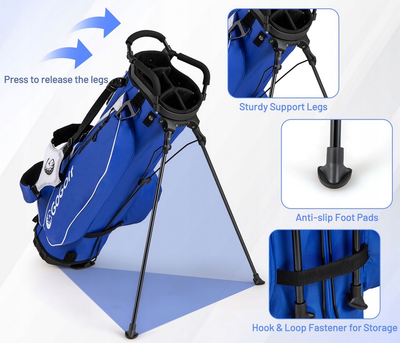 Множество вариантов переноски: Благодаря нескольким ручкам, мягким боковым ручкам, мягким плечевым ремням и выдвижным стойкам вы можете легко установить и транспортировать свое снаряжение для гольфа на поле. Чувствуйте себя комфортно и эффективно во время каждого раунда игры в гольф.