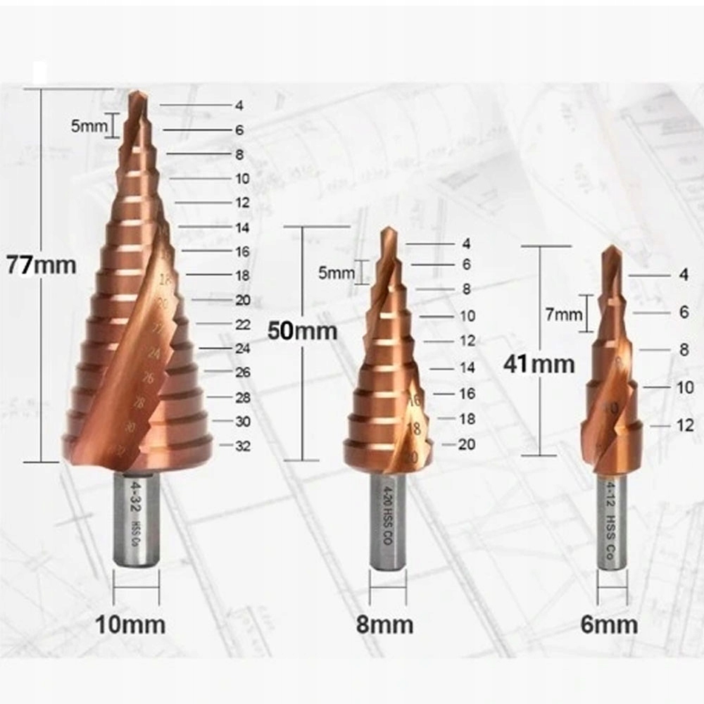 Ступенчатые сверла доступны в размерах 4–12 мм, 4–20 мм и 4–32 мм для удовлетворения различных потребностей в сверлении.