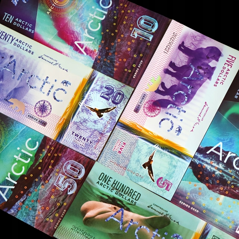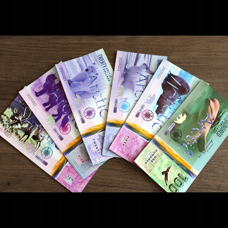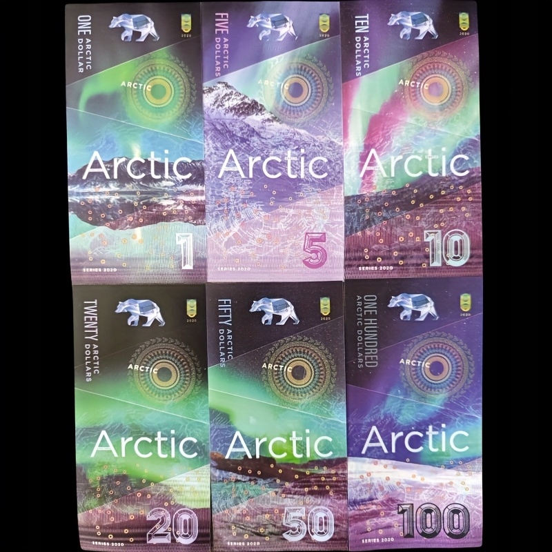 - Набор из 6 банкнот номиналами: 1, 5, 10, 20, 50 и 100 арктических долларов (все видны на фотографиях, кроме дубликатов реверса).