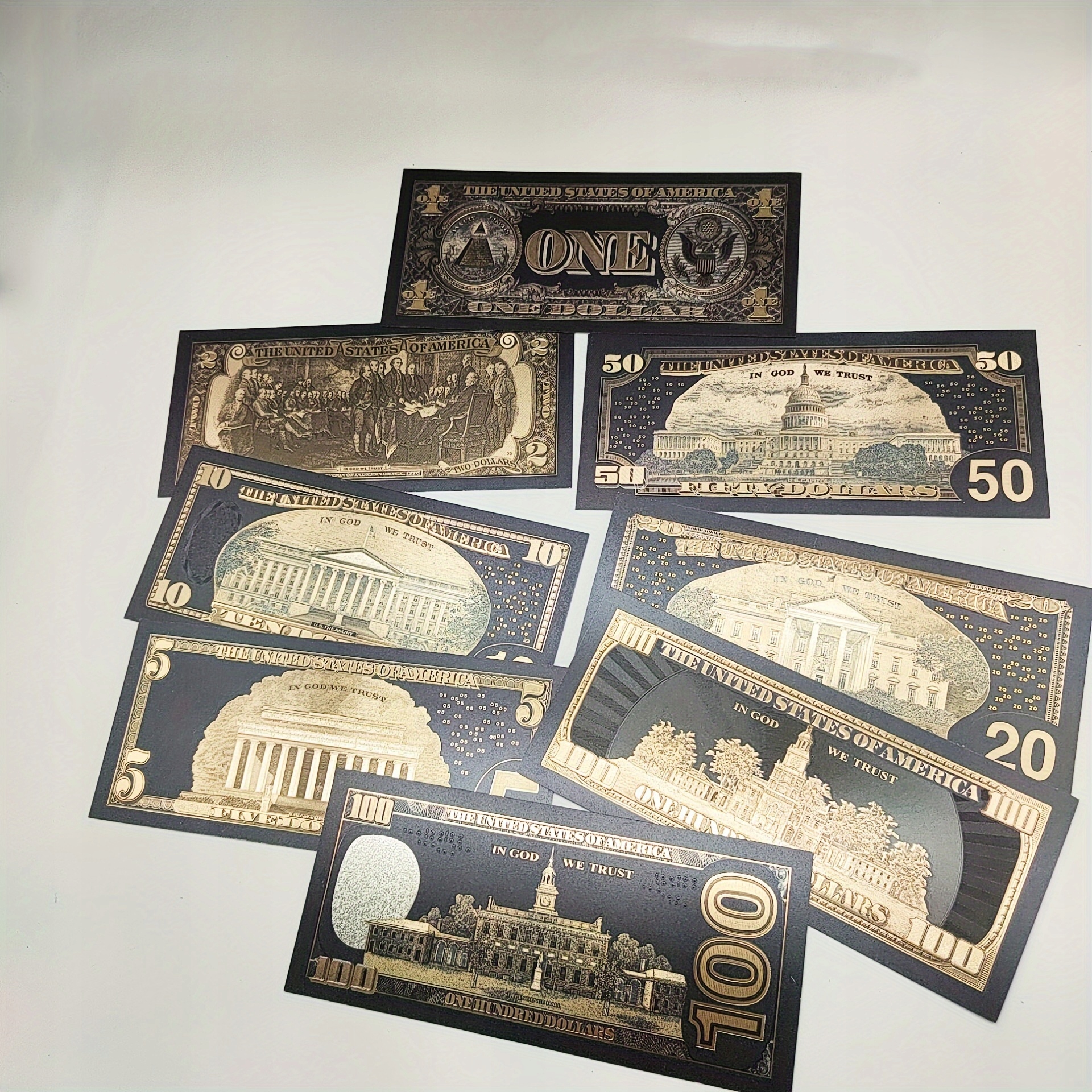 - Дизайн: Каждая банкнота имеет доминирующий черный фон с чудесно контрастирующими золотыми элементами. Изображения президентов, номиналы, печати и надписи точно воспроизведены в блестящем золотом цвете, что придает им роскошный и неповторимый вид.