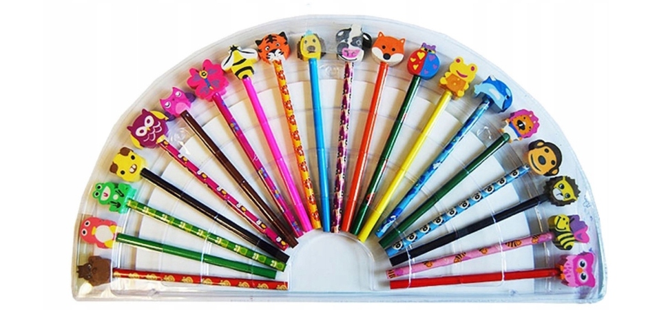 В комплект входит 18 мелков и 2 карандаша, а также 20 цветных ластиков и точилка.