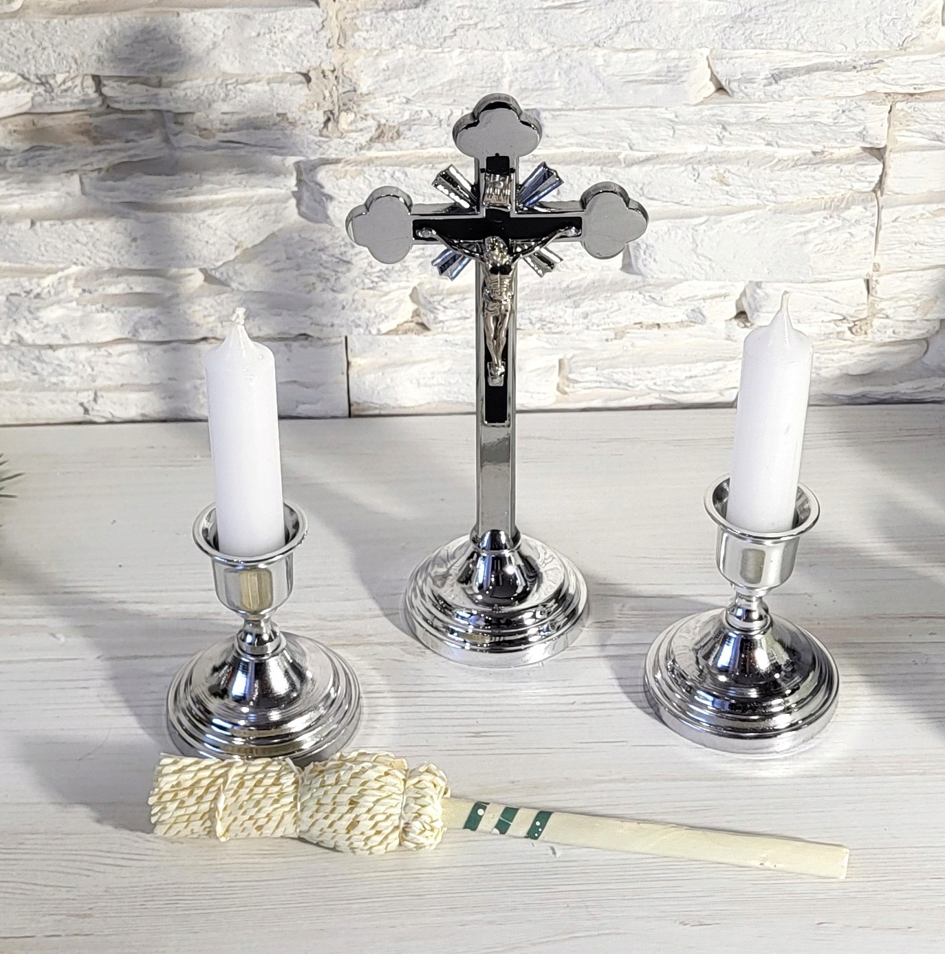 ✅Очень красивый и нежный серебряный металлический колядочный набор с белыми свечами.
