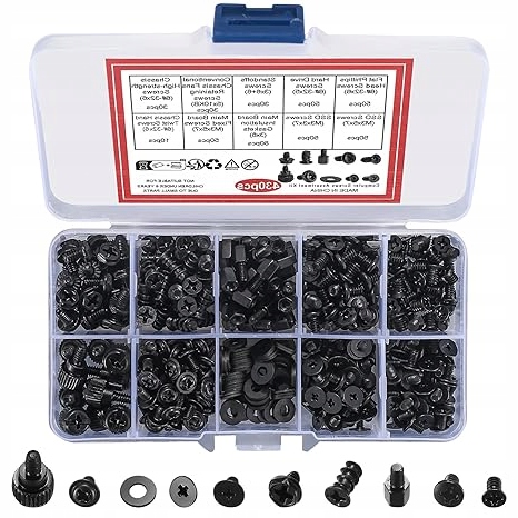 В комплект входит 430 винтов и прокладок для монтажа на ПК. Изготовлен из высокопрочной углеродистой стали, устойчив к коррозии, долговечен в использовании. Все элементы упакованы в практичную коробку, что облегчает упорядочивание и поиск нужного размера.