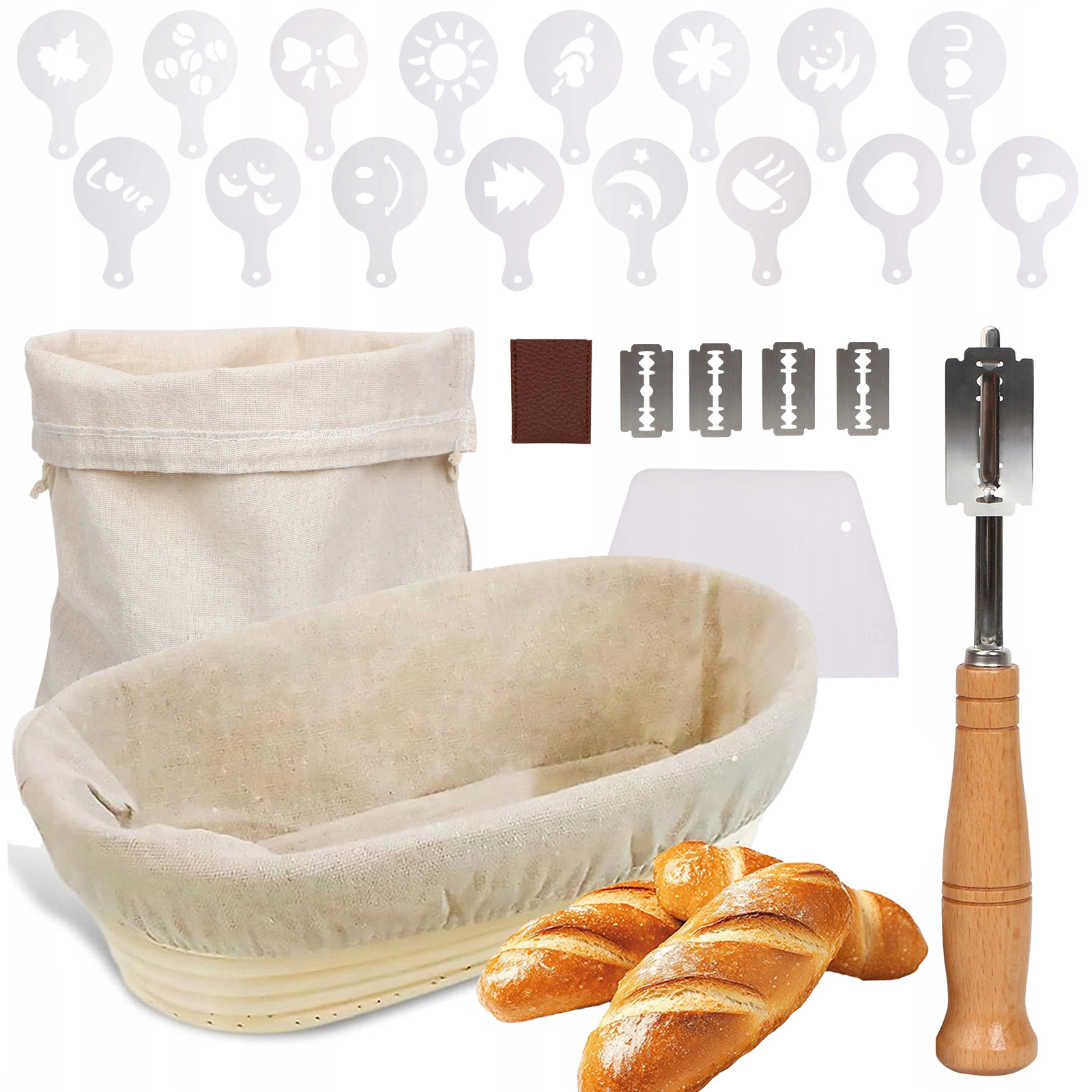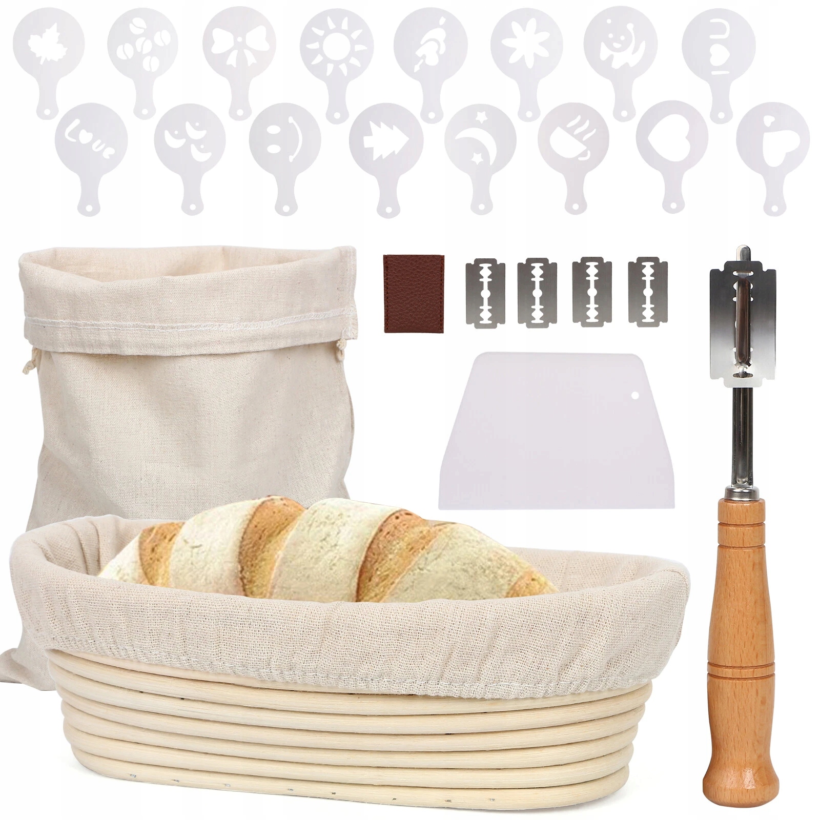 🥖【Полный набор корзин для расстойки】Корзина для расстойки может использоваться как профессиональными, так и домашними пекарями. В комплект входит все необходимое: 1 овальная корзина для хлеба, 1 льняная вставка, 1 скребок для теста, 1 мешок для хлеба, 1 нож для хлеба и 16 декоративных трафаретов.