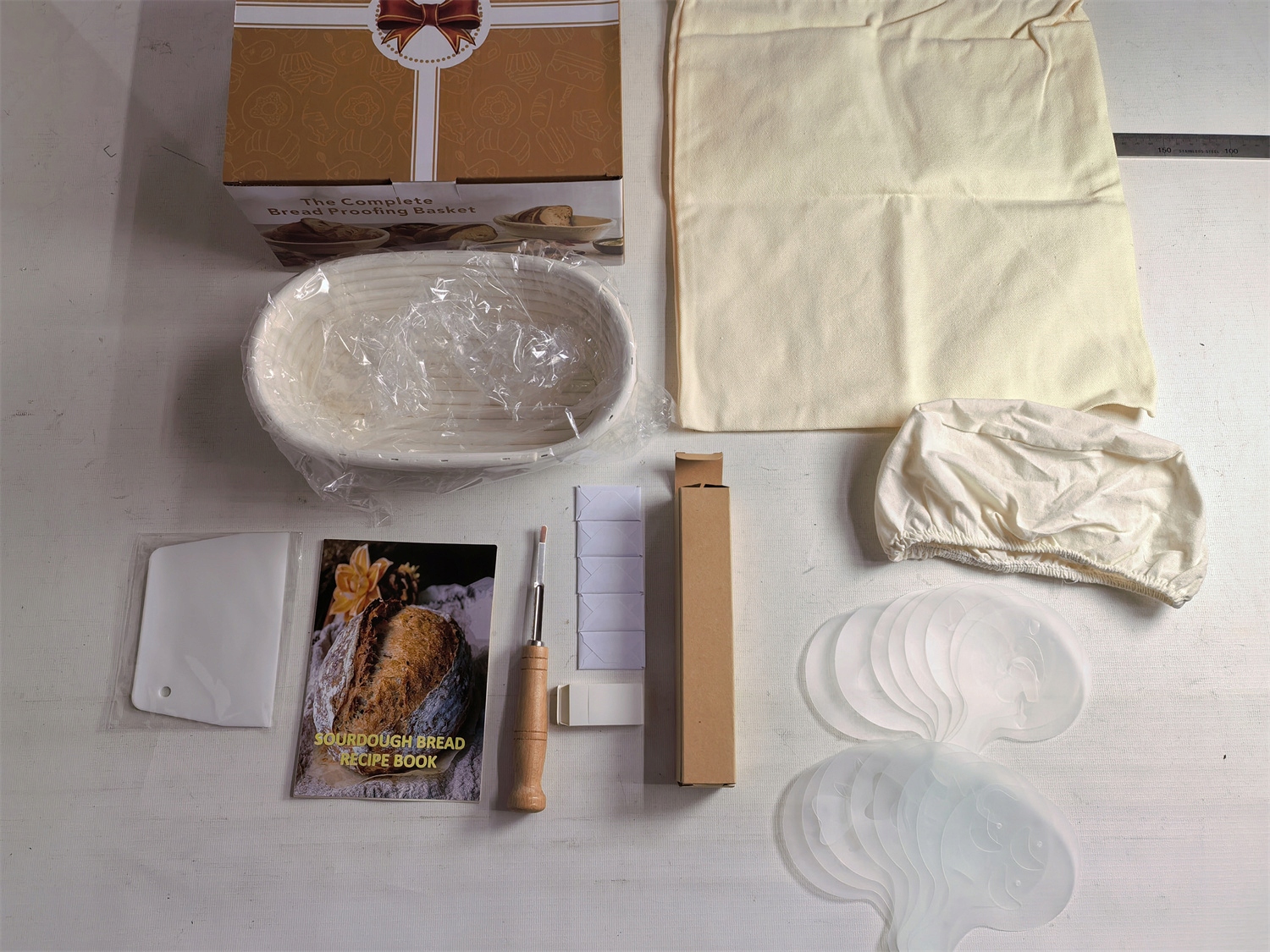 🥖【Полный набор корзин для расстойки】Корзина для расстойки может использоваться как профессиональными, так и домашними пекарями. В комплект входит все необходимое: 1 овальная корзина для хлеба, 1 льняная вставка, 1 скребок для теста, 1 мешок для хлеба, 1 нож для хлеба и 16 декоративных трафаретов.