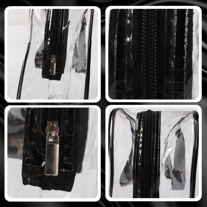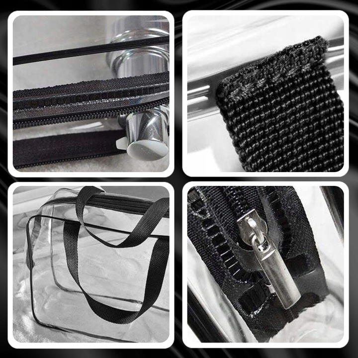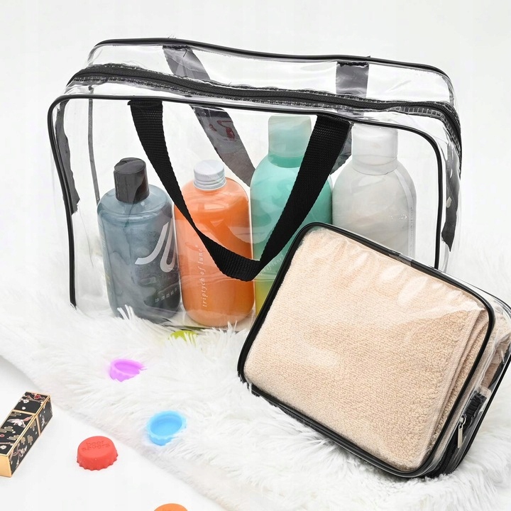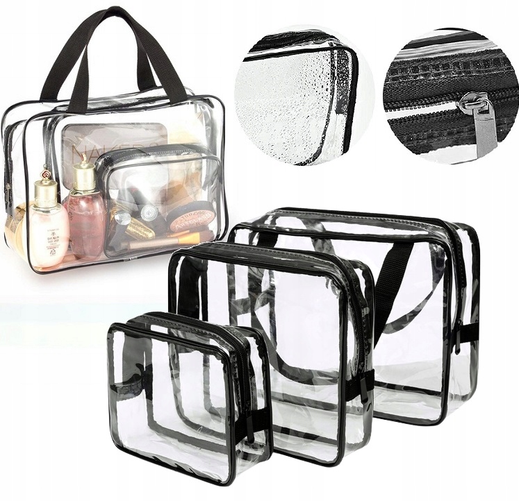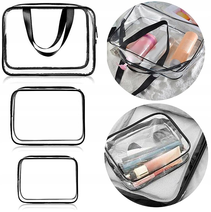 ✅Набор состоит из трех прозрачных косметичек - большой, средней и маленькой - изготовленных из водостойкого ПВХ-пластика, который легко чистится . Они идеально подходят для использования во время путешествий, в бассейне или тренажерном зале. В них можно хранить не только косметику и предметы гигиены, но и небольшое полотенце, кошелек и телефон. Прозрачный материал облегчит быстрый поиск необходимых вещей и ускорит регистрацию на рейс аэропорт. Самую большую косметичку можно использовать как сумочку благодаря длинной черной ручке.