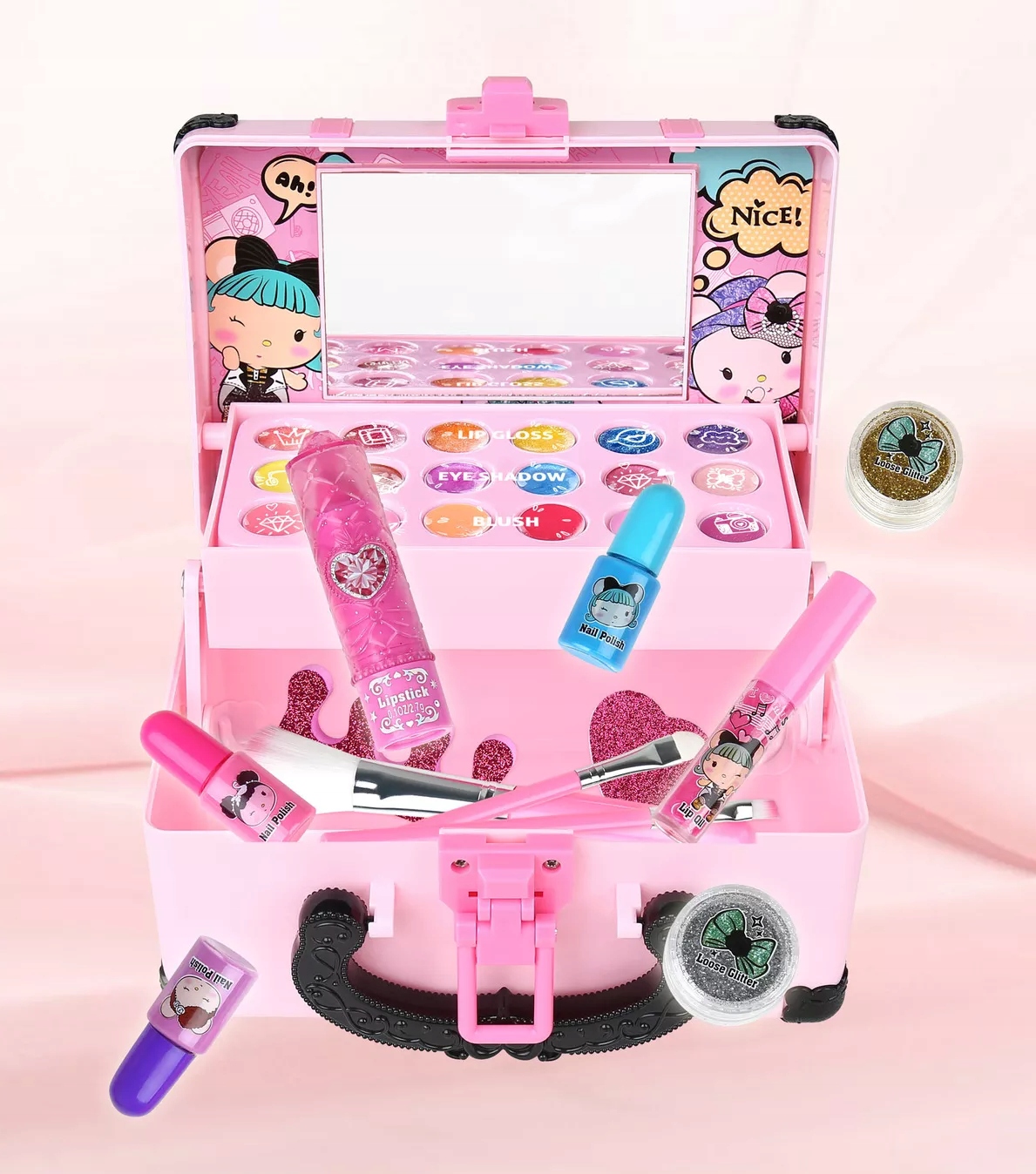 Богатая цветовая палитра теней, блесков для губ и румян позволит вашему ребенку создавать бесчисленные образы макияжа. Чтобы макияж был сделан красиво, в комплект входят соответствующие кисточки и зеркало. Помимо нанесения макияжа с помощью этого чехла девушка также будет ухаживать за своими ногтями, придавать им выбранный цвет и украшать наклейкой, и все это станет проще с помощью прилагаемых аксессуаров. Выбор фасона зависит от фантазии маленькой леди.