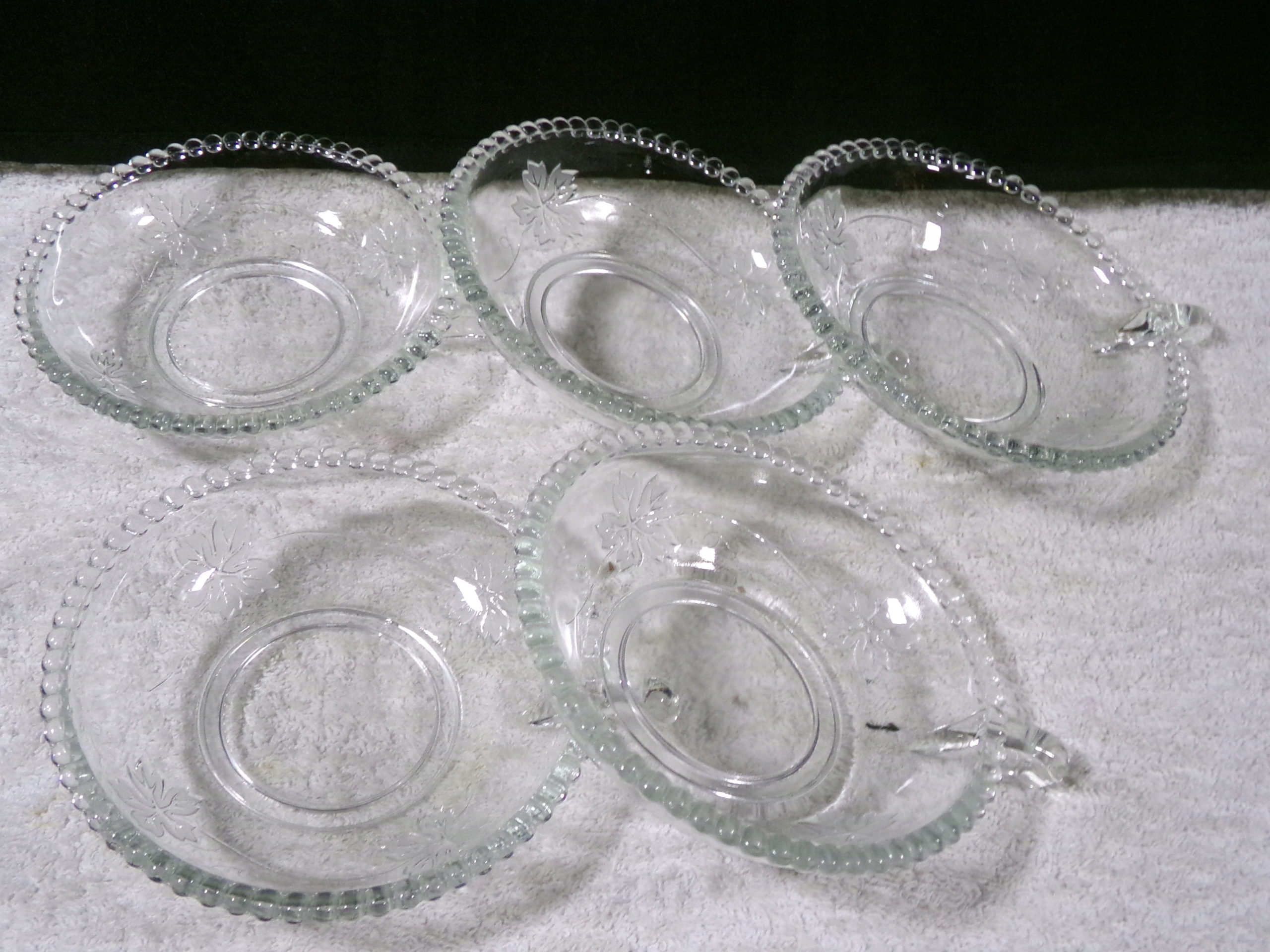 Набор из 5 красивых салатников с ручкой, диаметр 14х12 см, высота 3 см, вес 0,72 кг. В очень хорошем состоянии, без повреждений.