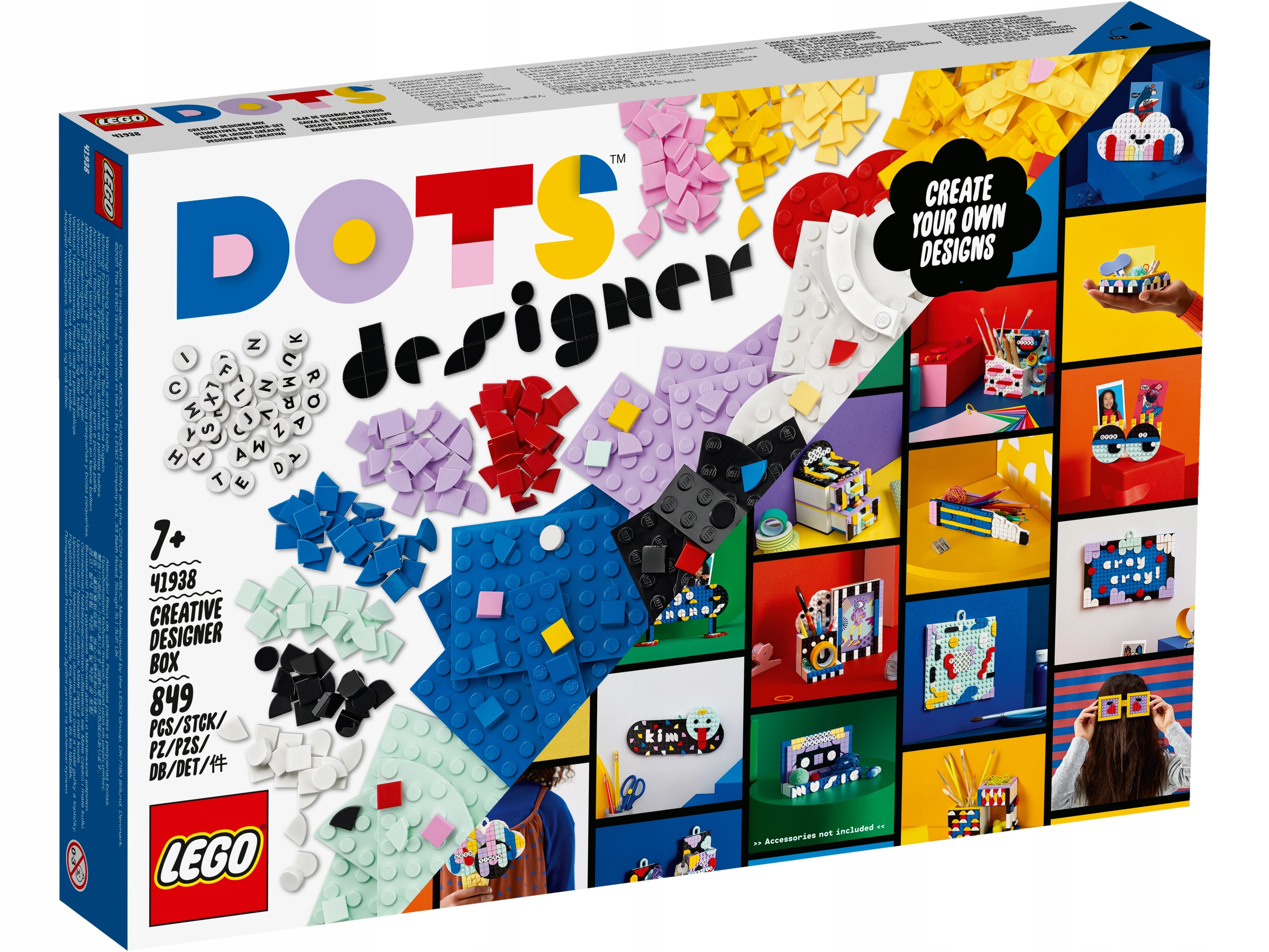 В комплект входит журнал с множеством креативных материалов. вдохновение, инструкции по созданию различных украшений для дома и инструкции по сборке пяти игрушек DOTS, представленных в журнале: органайзер для стола, двухуровневые ящики, доска для заметок, которую можно повесить на стену, рамка для фотографий и небольшой поднос. На построенных предметах можно создавать интересные узоры и надписи, используя красочные плитки и плитки с буквами, входящие в набор. Вы также можете воспользоваться дополнительными возможностями, предлагаемыми отдельно продаваемыми наборами DOTS Accessories — Series 5 (41932) и DOTS Miscellaneous (41935).