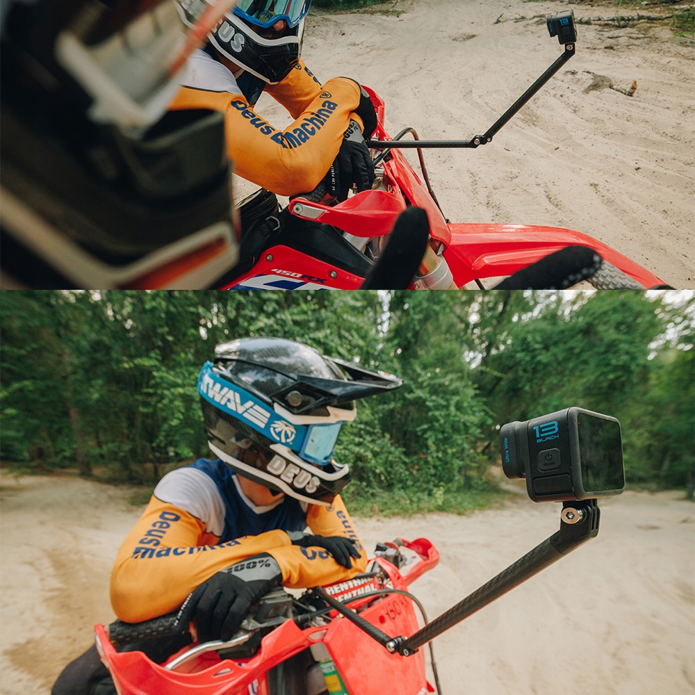 Совершенно новый Boom + Bar Mount состоит из стрел, изготовленных из очень прочный материал, например стекловолокно, предназначенный для установки в различных местах велосипеда, чтобы можно было получить интересные кадры как тогда, когда камера направлена нам в лицо, перед нами, так и когда мы снимаем сбоку велосипеда. Штанга также имеет точки поворота и шаровое крепление для камеры, что упрощает получение желаемого угла.
